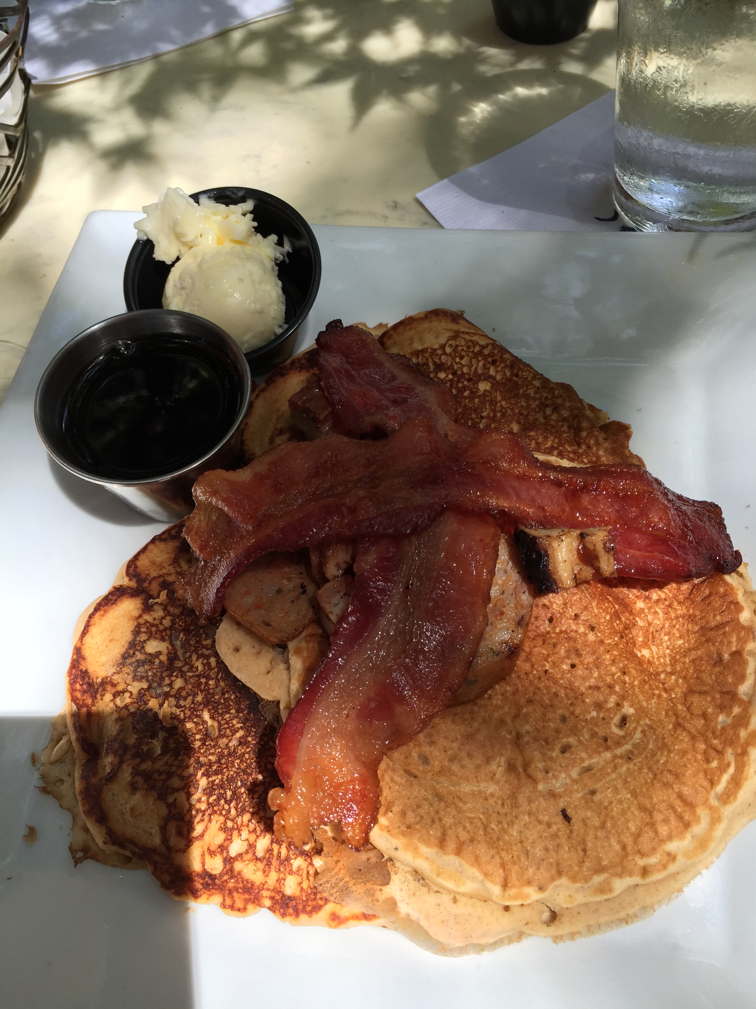 The hostess took us straight to a little wrought-iron table in the courtyard where we enjoyed the shade from the trees, being serenaded by the birds, and a pomegranate mimosa. Our waitress was beyond fantastic, incredibly sweet, and steered E in the direction of the pork trio pancakes (<– Three types of pork + pancakes. Let’s just take a minute to embrace the glory of that), which was an excellent decision.