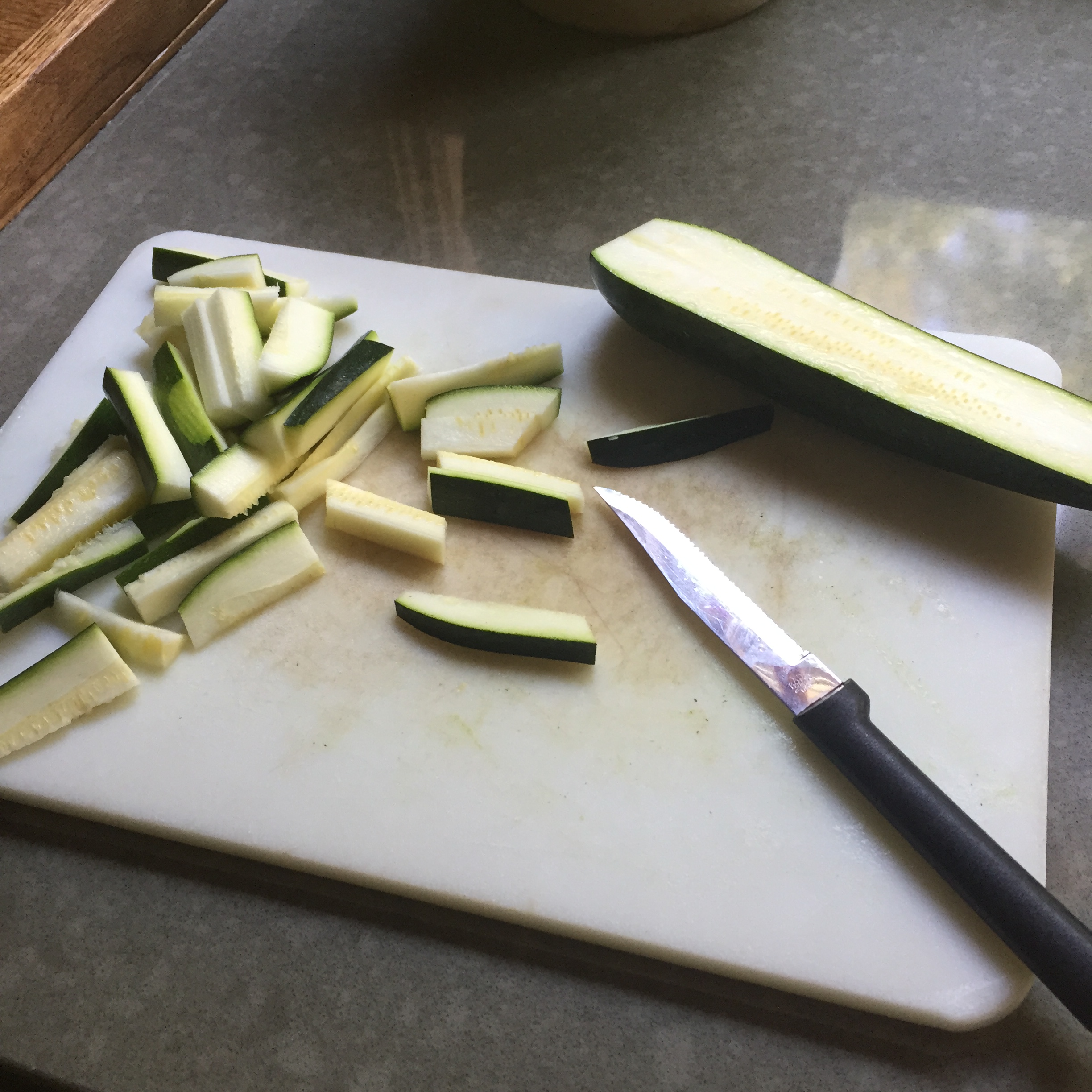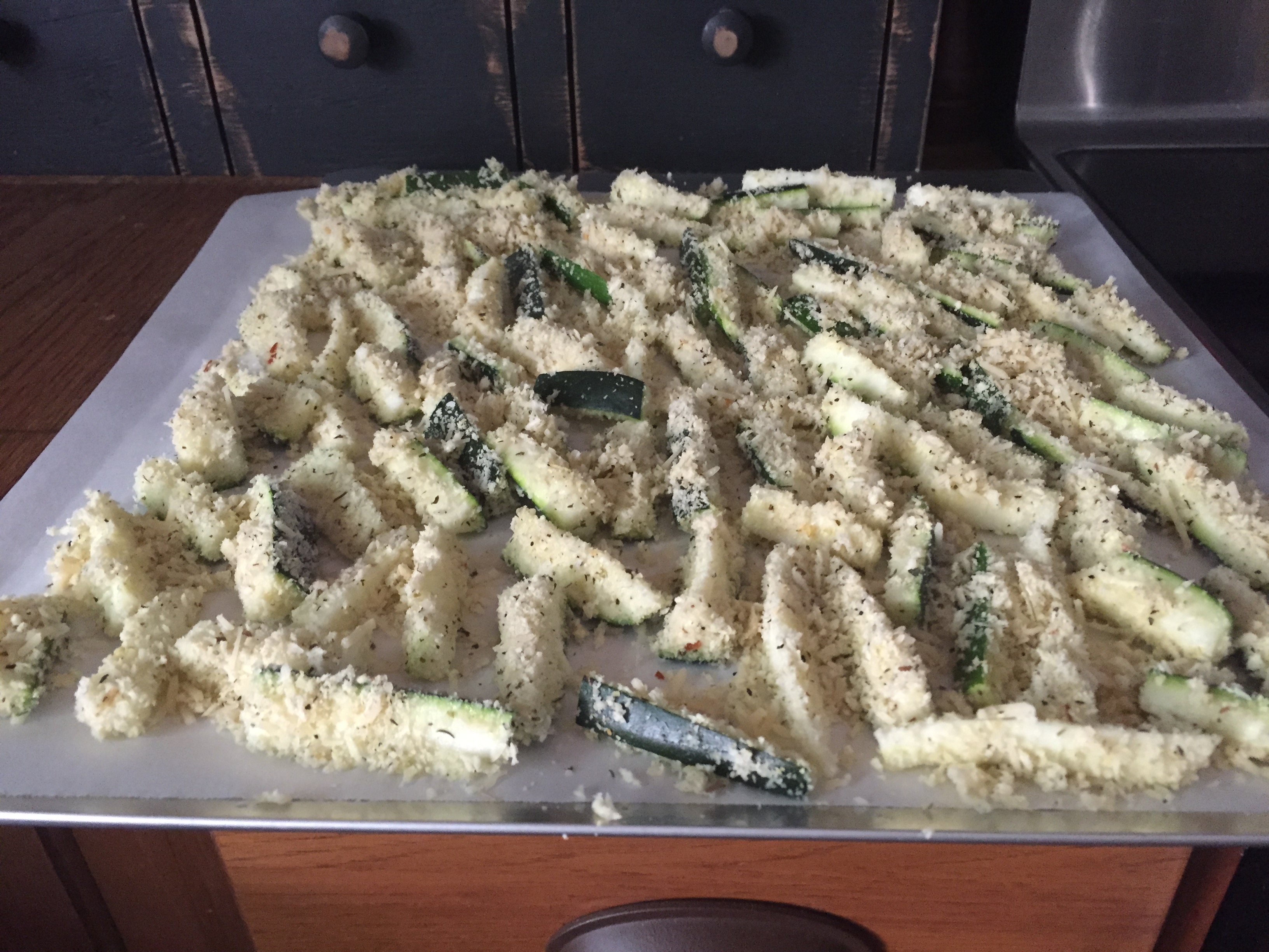 Preheat your oven to 475 degrees. Chop up your zucchini into sticks (I prefer mine to be thin).