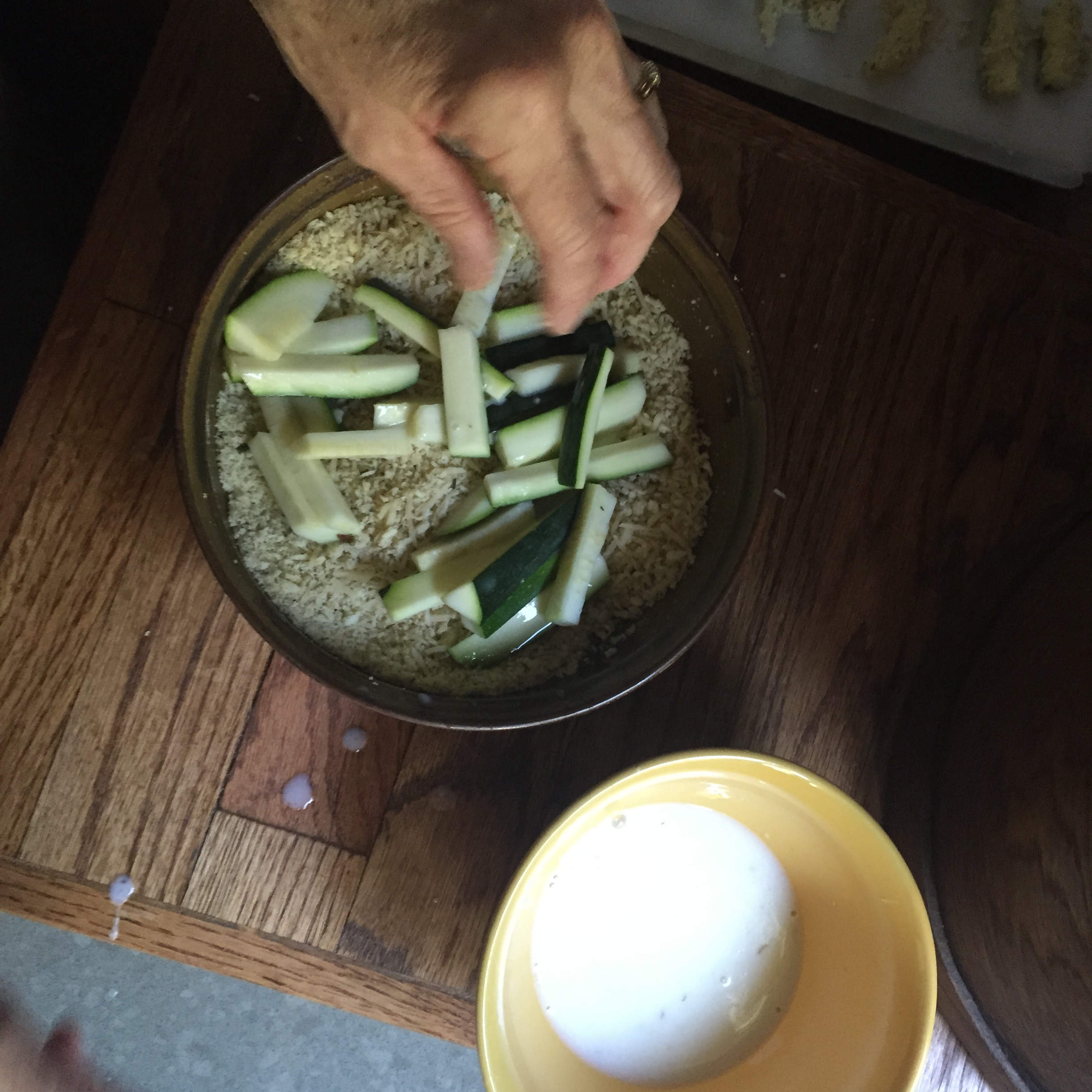 In one bowl, combine your bread crumbs, parmesan, salt, and pepper. In a second bowl, combine the milk and egg whites. Dip the zucchini sticks into the milk mixture, and then cover in the bread crumb mixture.