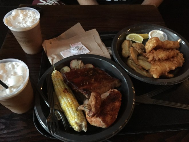 Before returning to Kong we grabbed dinner at the Three Broomsticks. I had my second frozen butterbeer and the chicken and ribs combo. The chicken was ok, but the ribs were pretty good! Boyfriend had the fish and chips.