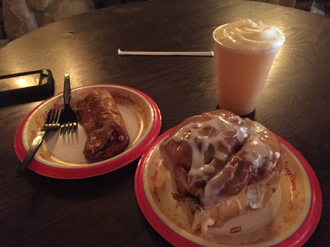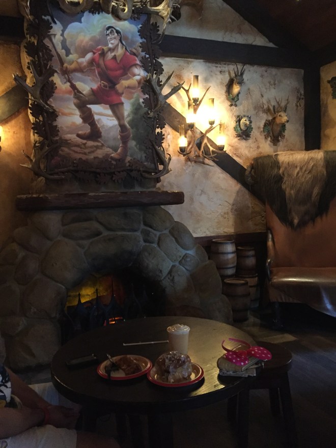 We had only completed three activities and were already hungry. We kept seeing people with giant cinnamon rolls walk out of Gaston’s, so going inside for food seemed like the only logical thing to do. The next logical thing to do was order a giant cinnamon roll, a ham and cheese pretzel, and LeFou’s Brew (it’s frozen apple juice with a hint of toasted marshmallow, topped with passion fruit-mango foam). I know, I know. What a weirdo combo – but TRUST ME. Freaking amazing.