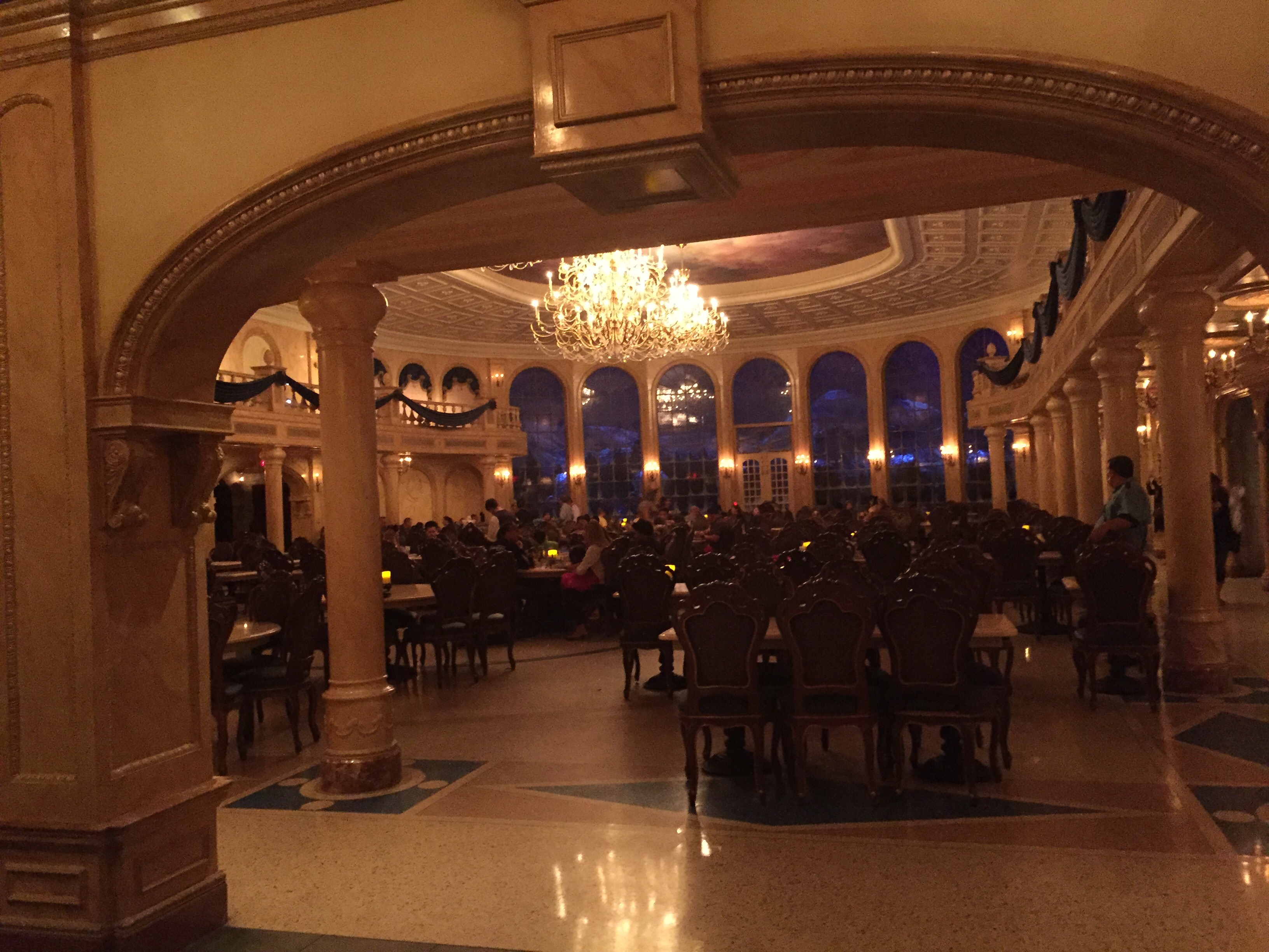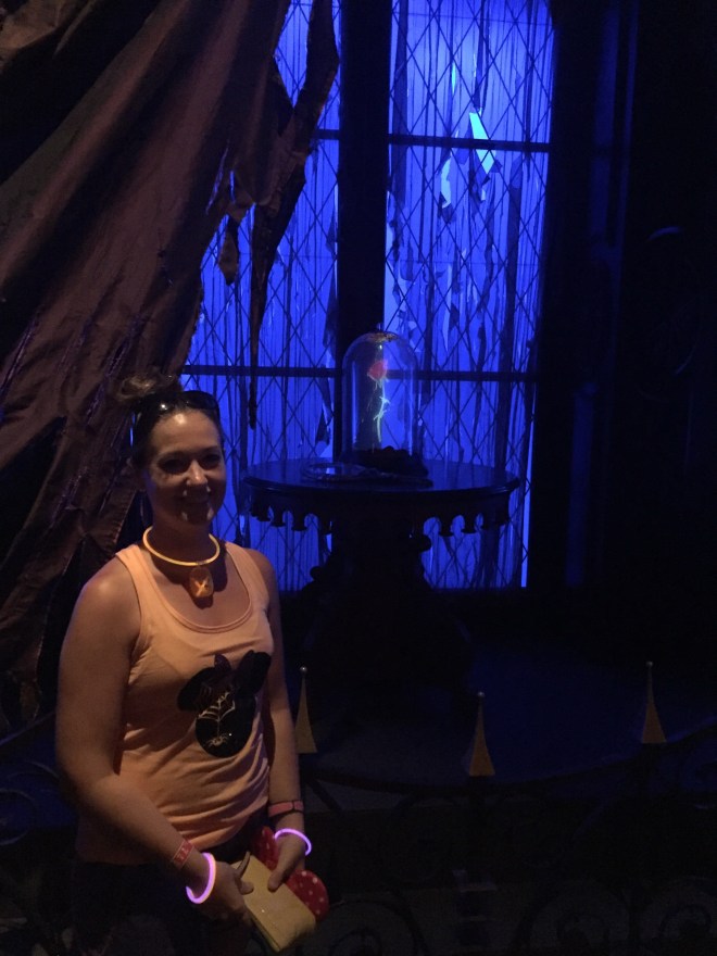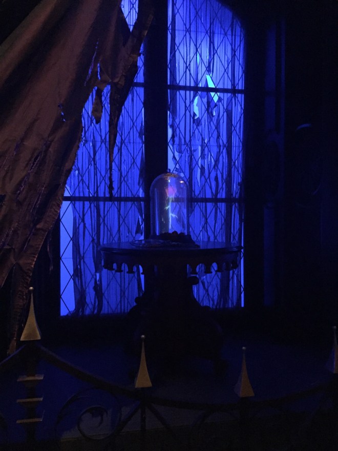 The Grand Ballroom is gorgeous (my pictures are a little dark since it was 9pm), but we were taken to a table in the West Wing (yessss!). It’s gloomy, dark, and a lot of the decorations are ripped, but it was so incredible. The rose is in this room, and about every 20 minutes or so there would be a flash of lightning and thunder (not so loud that you jump and spill your food), and then the portrait of the prince on the wall would change into the Beast!
