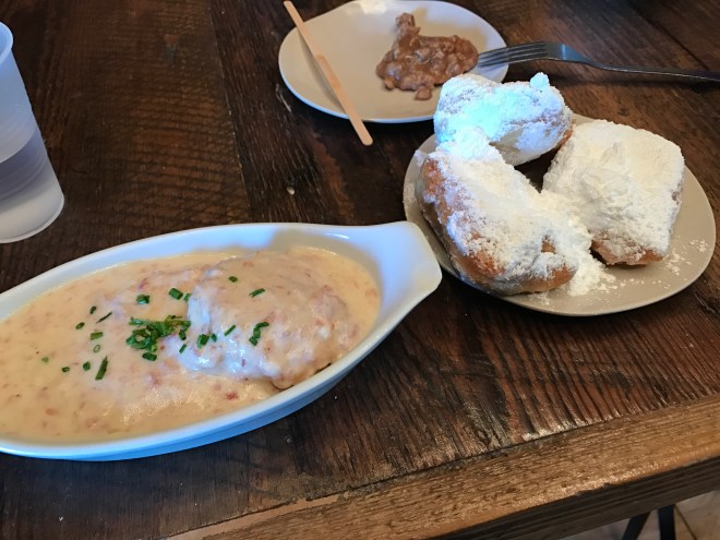 I ordered the beignets to split with my sister (because one should always order beignets) and the buttermilk biscuits and gravy. We also picked up bags of bacon popcorn to take home to our guys. I highly recommend a stop here!