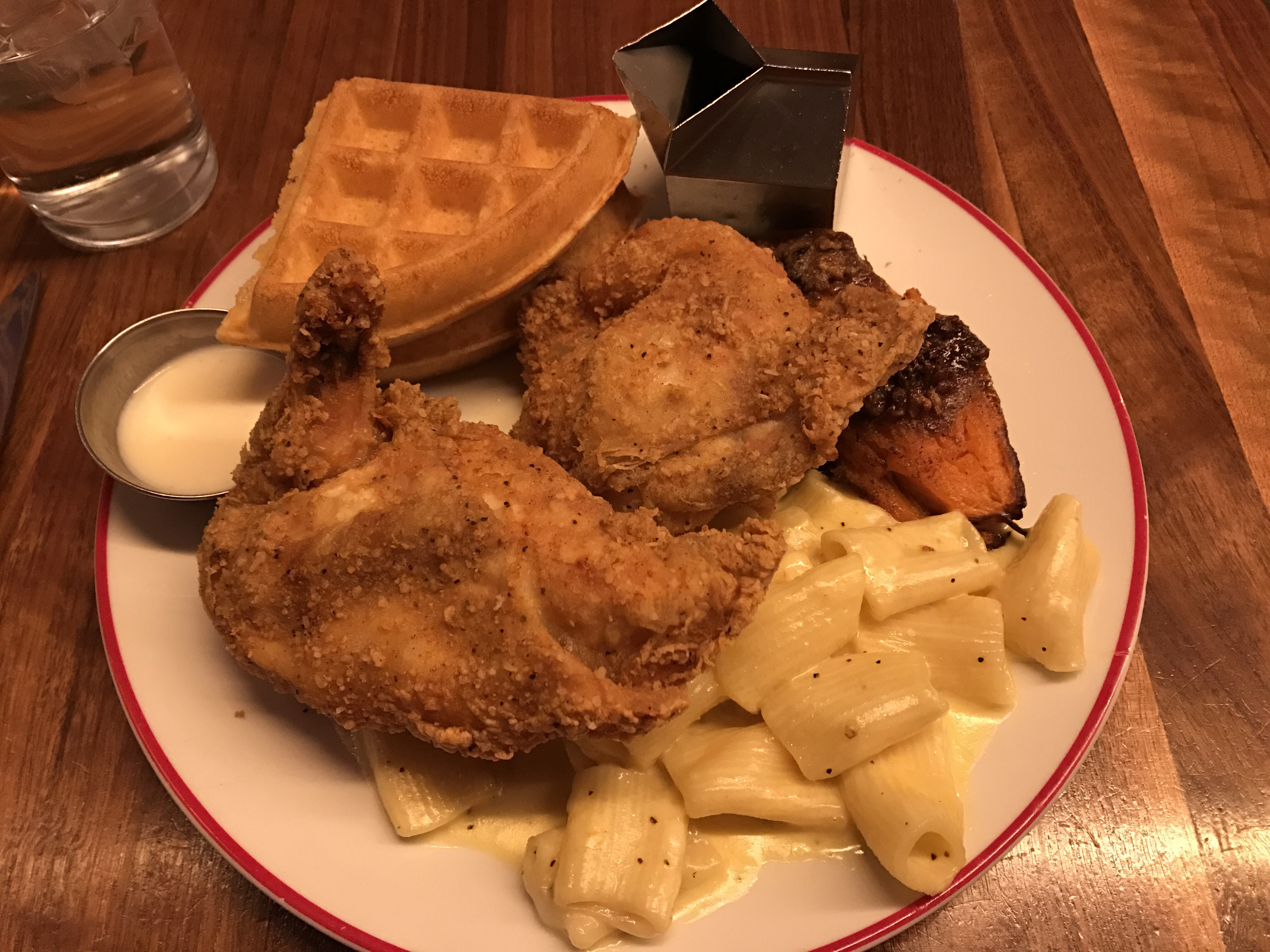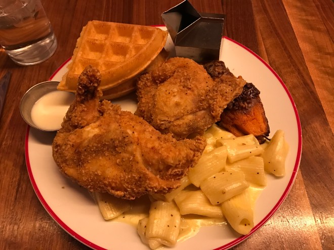 For my meal I had the chicken and waffles (and look at that delicious sweet potato covered in pecans and fig butter – that’s been replaced with green beans on the menu so maybe it’s seasonal?). My sister had the goat cheese ravioli which was also so amazing.