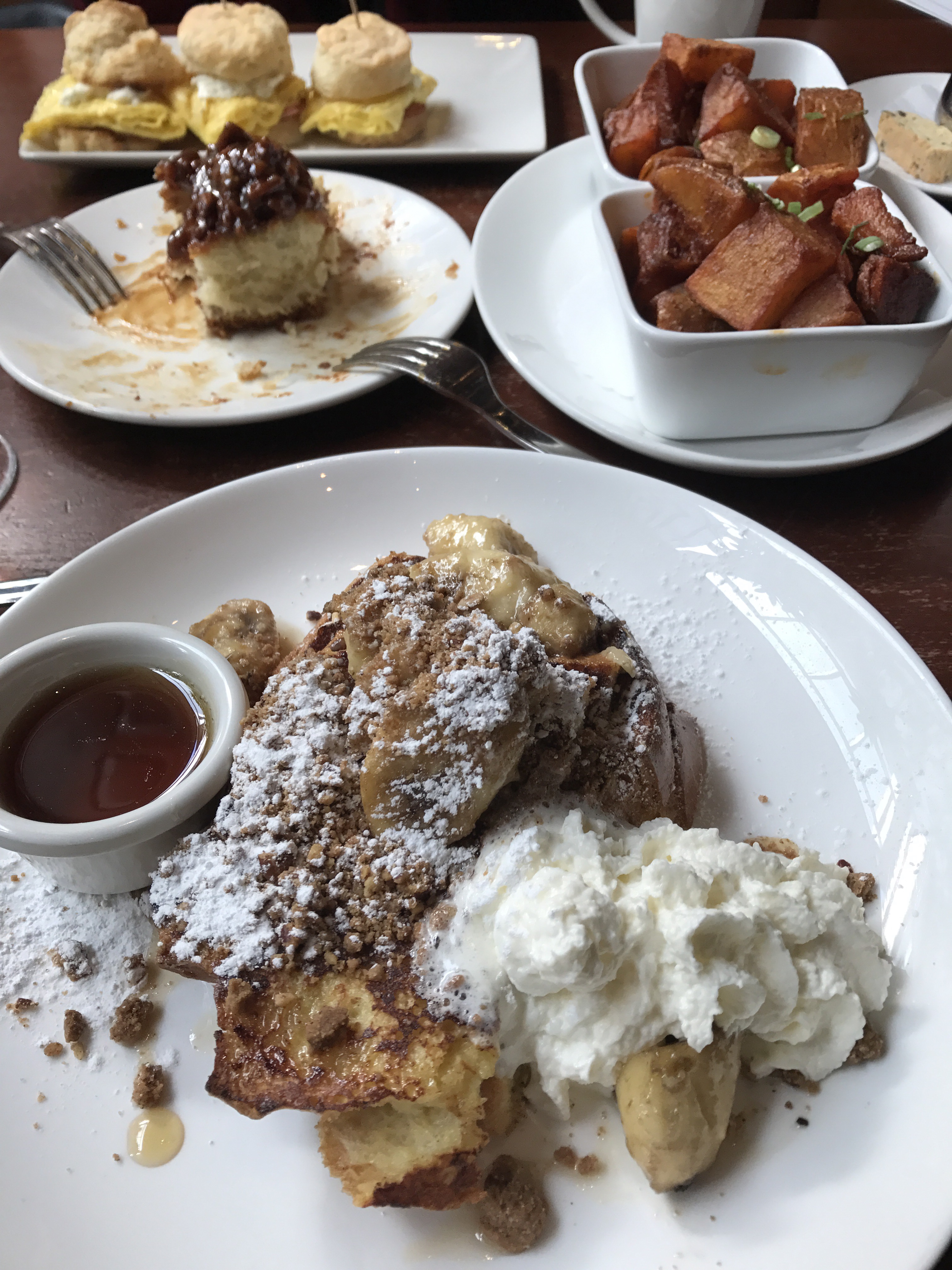 We totally didn’t need that sticky bun because as you can see from the picture below, we had a ton of food! I had the bananas foster french toast with LTD fries (our waiter explained that those were really popular and were limited, so once they sold out they were gone) and my sister had goat cheese biscuit sliders. Both of these entrees aren’t on the current menu, so I’m assuming they were seasonal for winter.