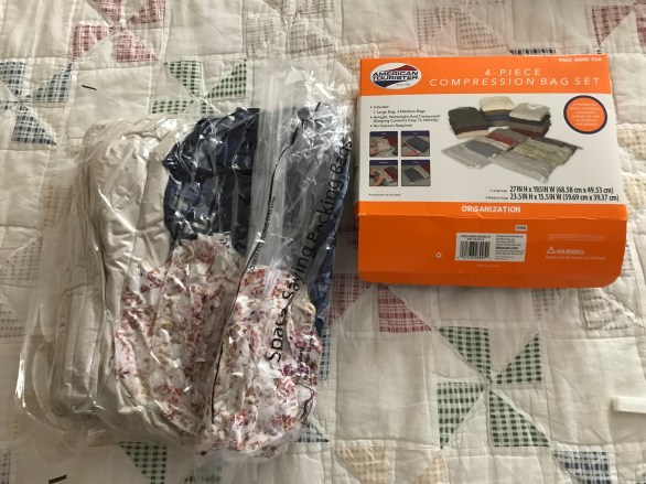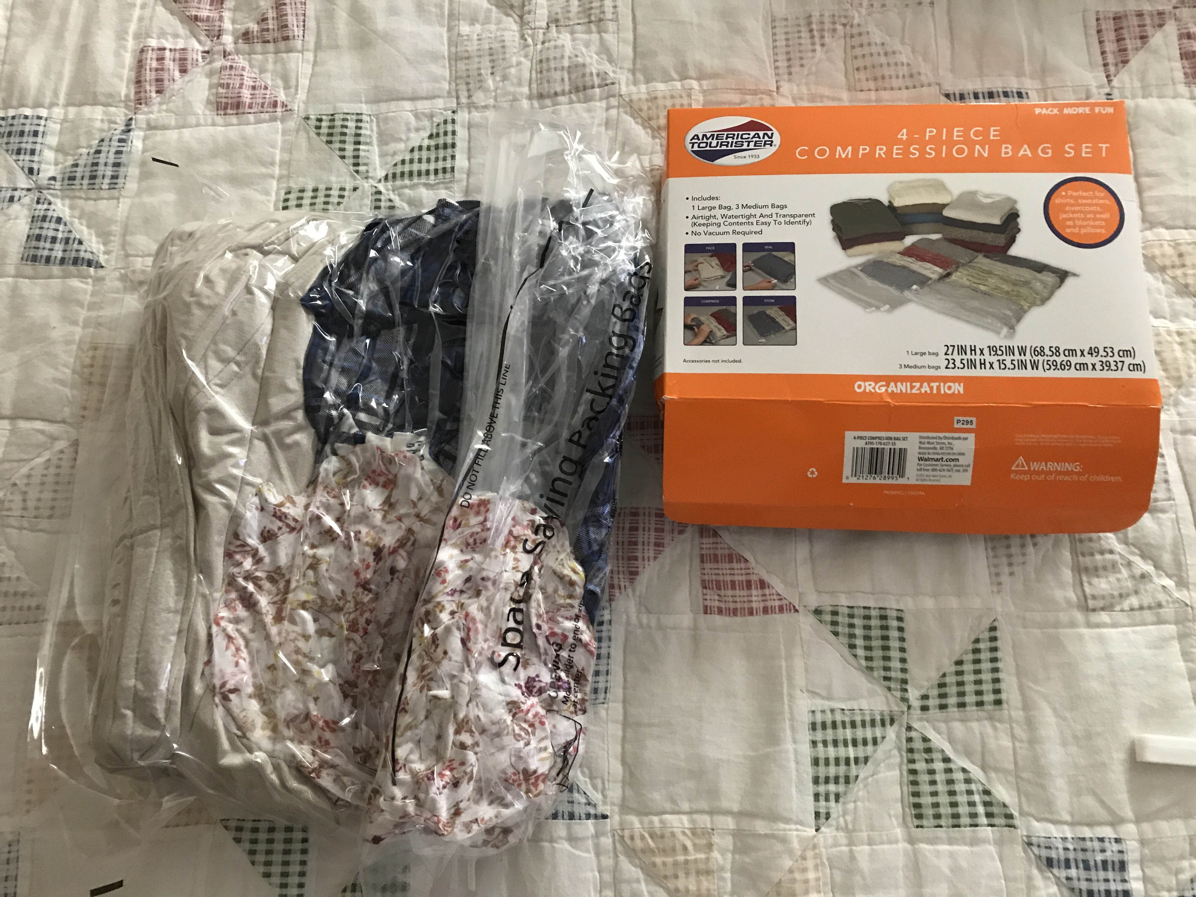 I wasn't planning on using these compression bags, but the layers in the previous pic were a little too puffy to fit well in my bag. I was super impressed at how flat these bags got, and they fit perfectly on the top of all my other clothing and shoes. Everything else I rolled and some of the smaller tanks fit nicely in small holes!