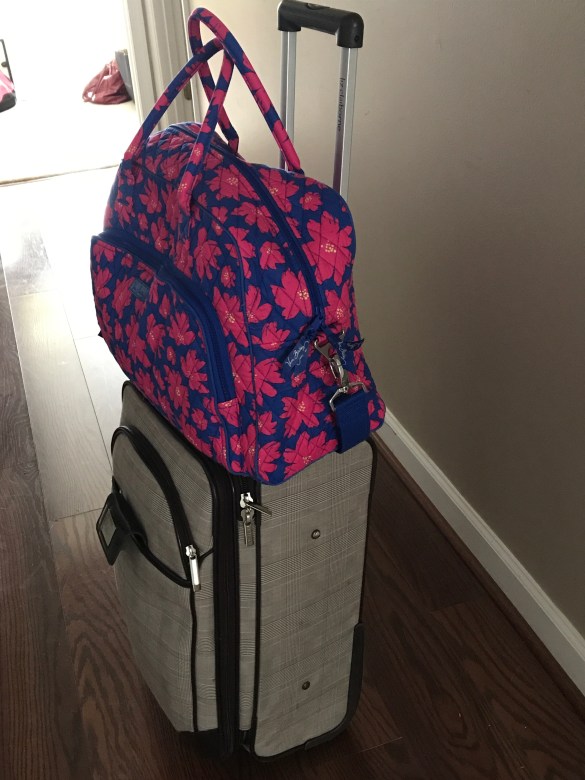 My personal item is the weekender bag from Vera Bradley that I got (on sale for 50% off!)specifically for this trip. Technically the measurements are a little too big for a personal item, but I'm hoping since it's cloth that I can stuff it easily under the seat. I have it loaded down with some books, my camera, my rain jacket, A LOT of protein and Clif bars, gummi worms (duh), and my small purse. And there's still a ton of room in it.