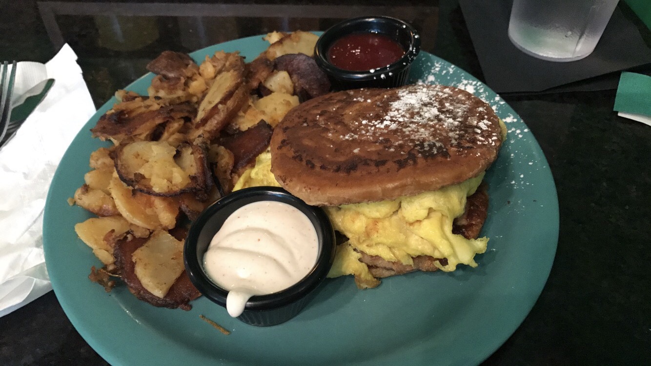 Just look at it in all its glory. The description from their website is “[a] breakfast sandwich on French toasted donuts filled with scrambled eggs, sausage…& cheddar cheese. Topped with powdered sugar & served with sides of zesty maple sour cream & strawberry habanero jam.” I can’t sell this enough to you. Strawberry habanero jam, y’all. My stomach is growling just thinking about it.