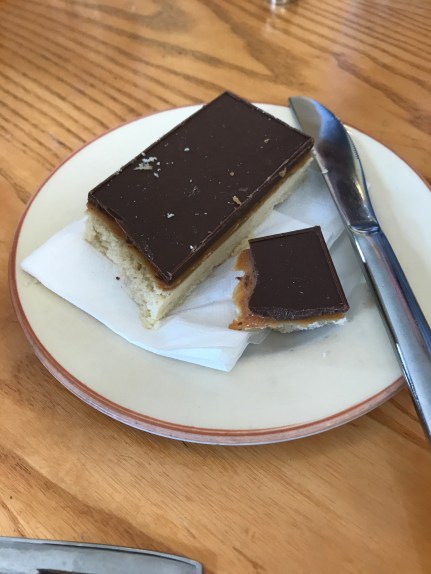 We both also picked out treats to split! I can’t remember the exact name of mine, but it was kind of like a Twix bar (only way, way better). The top was chocolate, the next layer was caramel, and the bottom was some of that famous shortbread that Scotland is known for.
