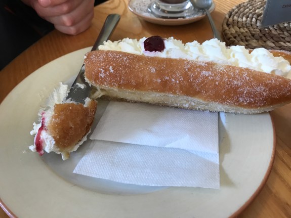 Fiancé got the doughnut below, stuffed with real whipped cream (not the junk we buy in cans and containers) and jelly. It was pretty rocking.