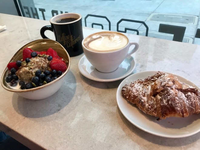 From left: delicious oatmeal, coffee, vanilla latte, and almond croissant