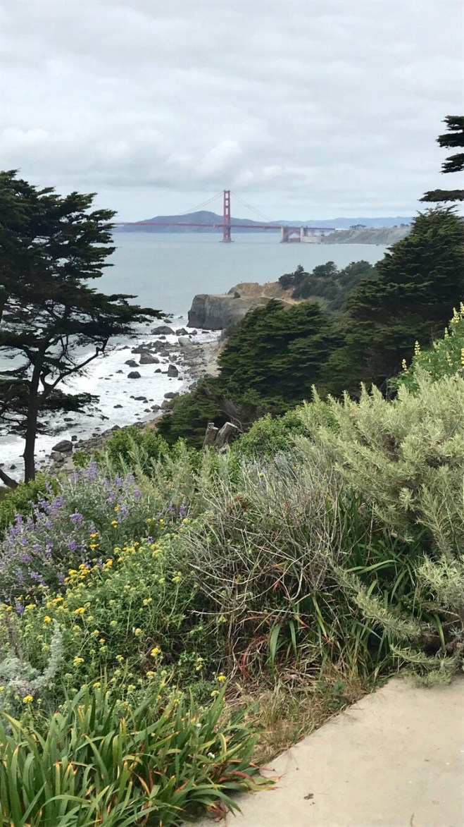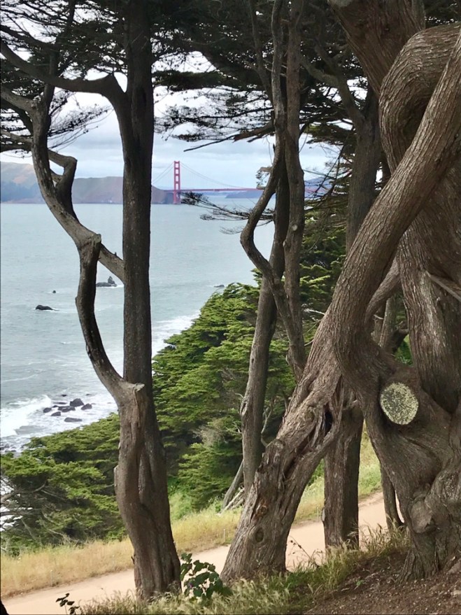 When we finally hiked, huffed, and puffed our way back to the main road, we walked a bit to another great viewing area – Land’s End. We scored a few terrific pics of the Golden Gate Bridge before a tour bus showed up and sent us running.