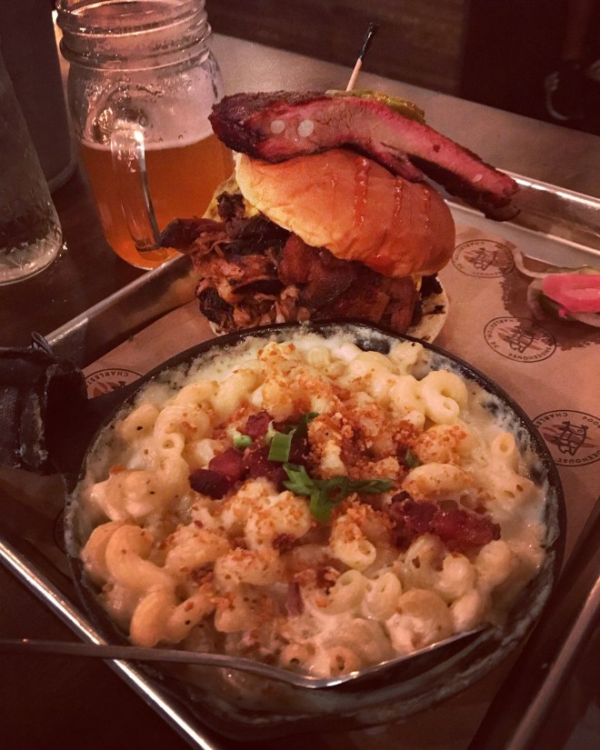 One of his requests was “macaroni and cheese with meat in it.” As soon as he said that I knew Poogan’s skillet mac ‘n cheese was what he needed. I had also mentioned the giant sandwich called The Four Porksmen – pork belly, pulled pork, smoked bacon, American cheese, bbq sauce, and a St. Louis rib – which J was immediately sold on. And as you can see in the pic above, he did, in fact, order the four porksmen and even added a skillet of the mac ‘n cheese to his meal, as though that wasn’t enough food 😂 He gave it a good run but couldn’t finish everything in one sitting.