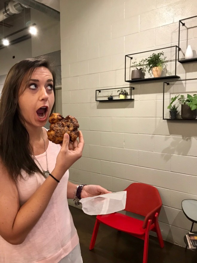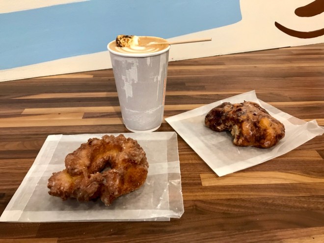 I don’t do the day until I’ve had coffee. After a little research on nearby coffee shops, my sis and I set out, but as soon as we walked outside the sky opened up. We waited it out as long as we could and made a mad dash to Big Shoulders Coffee on West Lake Street. I ordered a toasted marshmallow latte (go big or go home, amiright?) with a donut, and my sis ordered her routine sugar-free vanilla latte with an apple fritter.