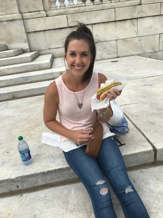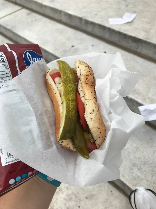 After we picked up our race swag, we were feeling a little hungry (although I had sampled some dairy-free cheese at the expo and just wanted something to clear my mouth out <ick>). We made our way back to the bus stop area where C had found positive reviews for a hot dog cart (Kim and Carlo’s Chicago Style Hot Dog Store, to be exact). We’d heard all the hype about Chicago-style hot dogs, so that was definitely on our list of things to do! A Chicago dog is an all-beef hot dog with mustard, onions, relish, tomato, celery salt, a sport pepper, and a pickle on a poppy seed bun. I hadn’t planned on being so daring, but when in Chicago, you gotta do what the Chicagoans do! And it was actually pretty tasty! I don’t eat tomato, raw onions, or relish, so I was kind of shocked that I enjoyed it as much as I did!