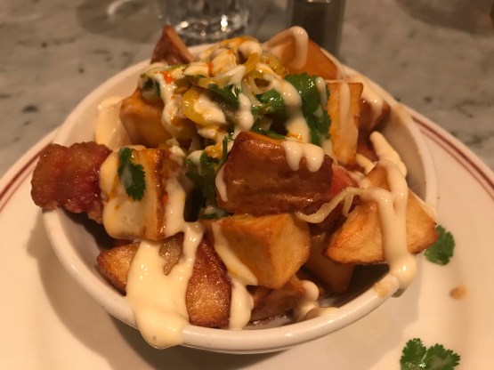 I saw pork belly on the menu, and if you’ve noticed anything about my eating habits, it’s that I never turn down pork belly. Their version was pork belly home fries – big chunks of potato and pork belly with pickled peppers, cilantro, and fish sauce vinaigrette. Yum.