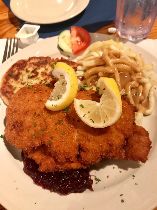 After a lot of deliberation (because there are so many things on the menu that look delicious), I ordered the pork schnitzel with spaetzle and potato pancakes. It was incredible, and I was SO full by the end. This meal ended up being our lunch AND dinner.