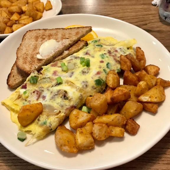 I’m normally a sweet-or-nothing breakfast woman, but for some reason, I was really craving a savory meal, so my pick was the Carolinian omelet (bacon, sausage, onions, peppers, cheddar, minus the mushrooms) with a big helping of home fries.