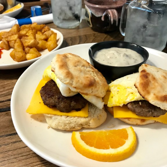 My sister had a craving for biscuits and gravy and was happy with her Biscuit Shack that included eggs and sausage!