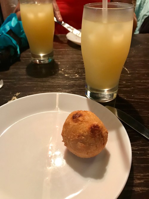 We had Coxinha de Frango, which are chicken croquettes (little fried balls of shredded chicken and cattupiry cheese). We also had a glass of cashew juice! It took me a sip or two to get into it, but it definitely grew on me and seemed to also have some pineapple juice in it? Definitely interesting!