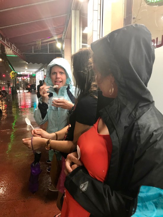 Our last stop was for dessert, and we still laugh about this one. Our guide was really selling a tres leche cake and even offered to go pick it up and bring it to our current location. We should’ve taken advantage of that offer because it started pouring rain. We thought we were going to another restaurant…but then he stopped outside a real shady grocery store/bodega and came out with packaged cakes. We were cracking up as we ate these things on the sidewalk in the pouring rain. Definitely a memory!
