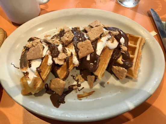 I, in true Autumn fashion, ordered the s’mores waffle, topped with delicious Nutella, toasted marshmallow cream (I can eat that stuff out of the container), and graham crackers. So good!