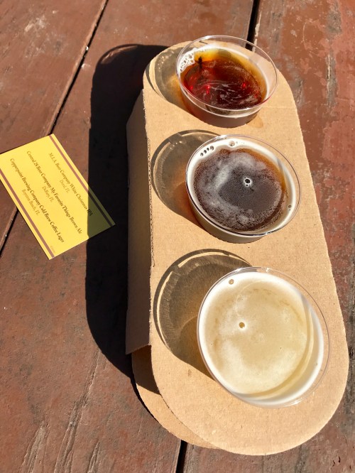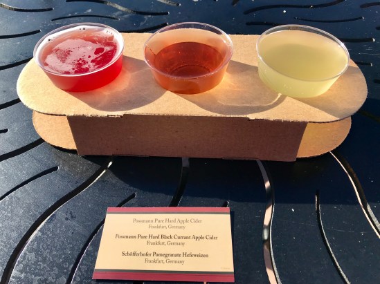 After that we took another break so I could get the cider flight at the Germany kiosk. The ciders are in reverse order in the picture, so the yellow one is the Possmann Pure Hard Cider, the middle is the Possmann Pure Hard Black Currant Cider, and the pinkish on the left is the Schofferhoffer Pomegranate Hefeweizen (isn’t that a beer?). My favorite was by far the black currant cider, and John was a big fan of the hefeweizen.