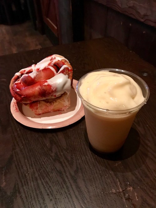 We also like getting one of the big cinnamon rolls (it’s not as good as my mom’s homemade ones, sorry Disney, but it’s still a good breakfast treat!). I love that they dyed the icing red for the holidays!