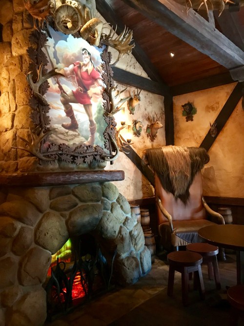 Our next plan was to visit Gaston’s Tavern, which is probably my favorite place at Magic Kingdom (other than the Be Our Guest restaurant). It’s cute, it’s hidden in the back, and the LeFou’s Brew drink is so dang delicious. The description is a little confusing…frozen apple juice with a hint of toasted marshmallow and topped with all-natural passion fruit-mango foam…but trust me. As weird as that combination sounds, I have been craving that thing since we were there in 2016. For some reason, it’s a super strange combo that magically works!