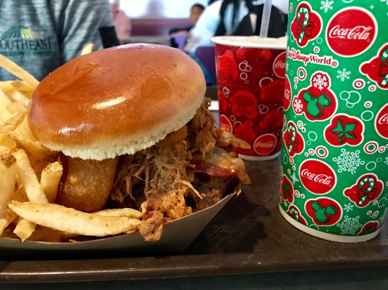 We walked around and looked at several menus before deciding on returning to a place that we both used to visit as kids – Cosmic Ray’s Starlight Cafe. It’s a quick-service restaurant, and it was super busy like most of the other places at MK that day. John opted for chicken tenders and I ordered the bbq pork bacon cheeseburger.