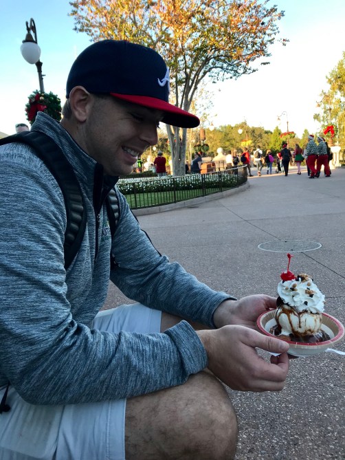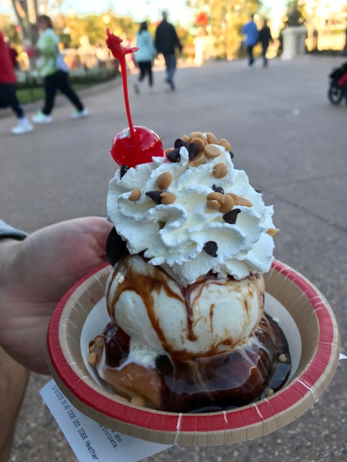 There were many rides in between our lunch and the next snack, but there was definitely a next snack. It got pretty warm, so we both ended up craving some ice cream, and earlier that day we had walked by the Plaza Ice Cream Parlor in the Main Street section of the park and saw a doughnut sundae that we obviously had to have.
