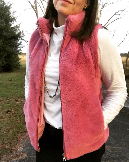 The faux-fur vest below is another item I needed as soon as I saw it. It’s incredibly soft, and I love LOVE the color (guava berry – how fun is that?). Pair it with some black skinnies or throw it over a white dress for a fun and casual Valentine’s Day look.