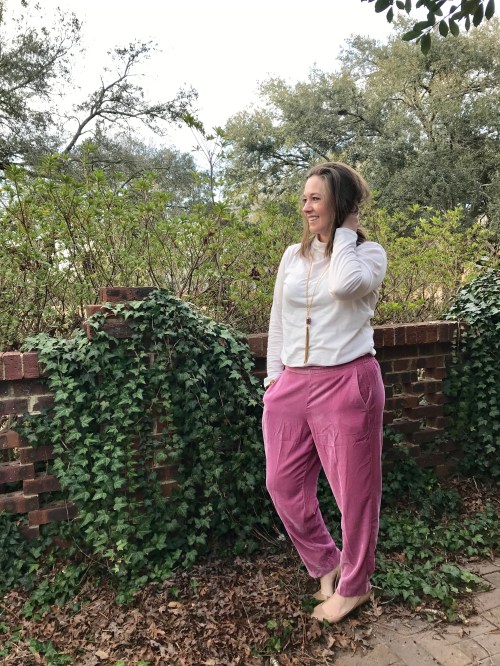 Drapey Pull-On Velvet Pant, J.Crew Factory (pink is out of stock, but there are still a couple sizes in black which would look so cute with a bright red top!, similar) | Turtleneck, Belk (similar) | Nude Heels, old (similar)