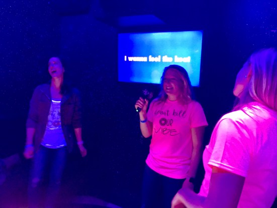 I thought we’d have some time for a quick nap, but I had us do a little too much walking, so everyone did a super quick change into our bachelorette party shirts (made by my friend, Corrine!) and we packed back up to head to a private karaoke room at The Highball!