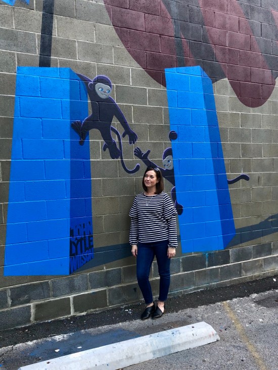 On our way, we passed another great mural of a robot and some monkeys. There’s no way we could pass up a photo op there! This mural, made by John Lytle Wilson, is on Morris Avenue. It’s next to a parking lot and some railroad tracks and is completely unexpected!