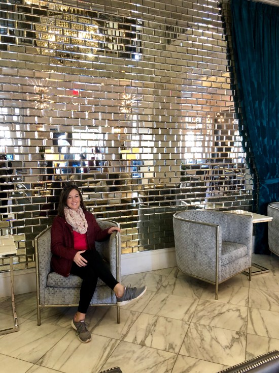 We finally stopped for brunch at Harvest Restaurant located in The Redmont Hotel. Both the restaurant and the hotel are beautiful in a building from 1925. I couldn’t pass up a photo next to the shimmery wall in the lobby.