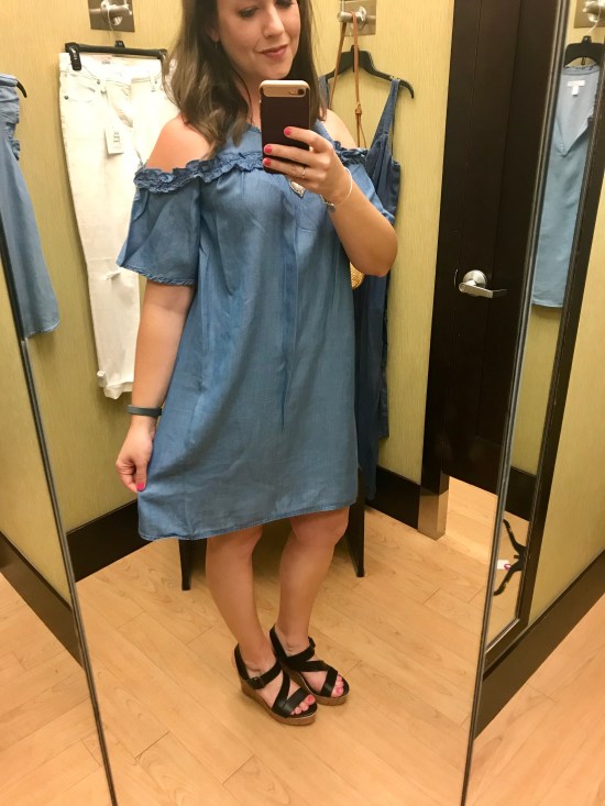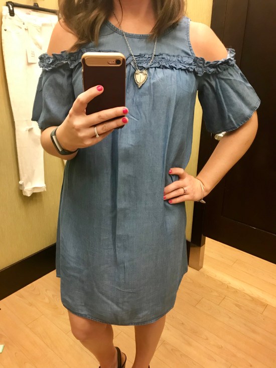 Next up is my favorite piece from the day – a super adorable chambray cold shoulder dress!