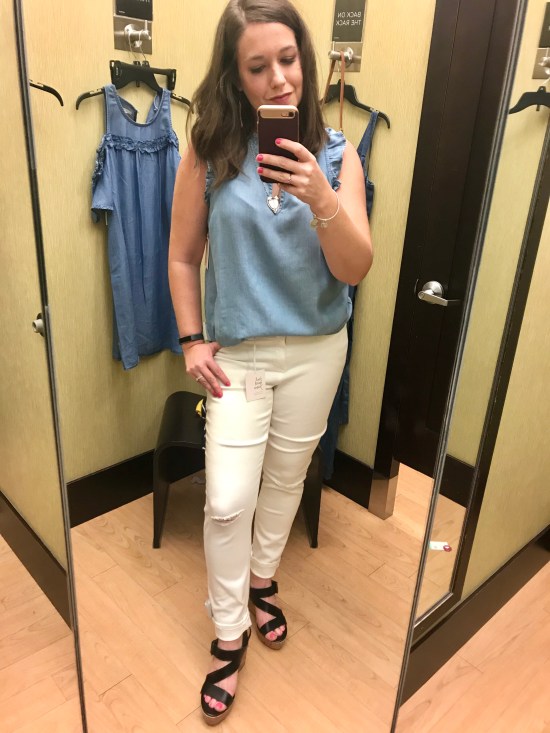 And last up is a chambray top with distressed white jeans. I love chambray and white – it’s so clean, simple, and classic. Chambray and white is one of my favorite combinations for spring, and you can pair the chambray top with white shorts when it gets too hot for long pants.