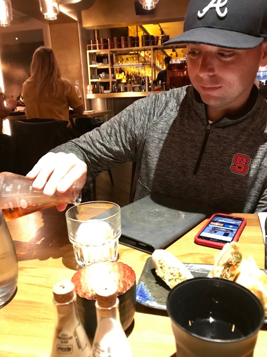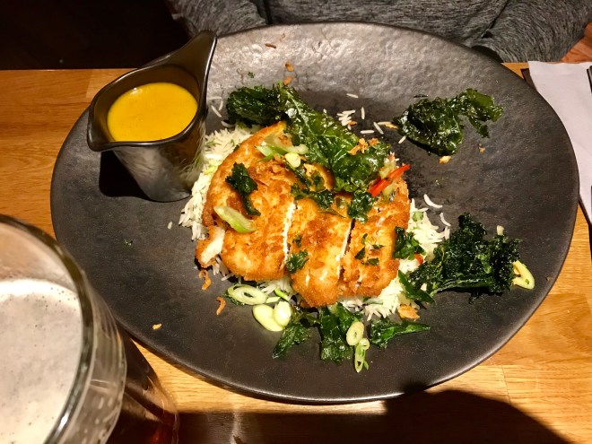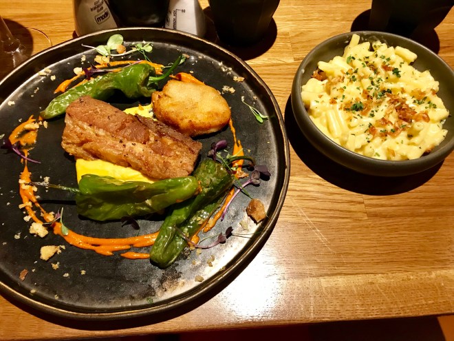 For dinner, I ordered the crispy pork belly (not as good as pork belly in the South, sorry London) and a side of mac ‘n cheese. John ordered an appetizer of duck spring rolls (not pictured) and the chicken katsu curry. The food was ok, but the drinks were definitely the highlight of our stop here.
