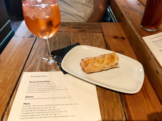 The kitchen wasn’t open until noon, so we grabbed drinks (mine was not good…I asked for the Beefeater Blood Orange gin and tonic, but it wasn’t the same drink I had from another pub, unfortunately) and a little sausage pastry to share.