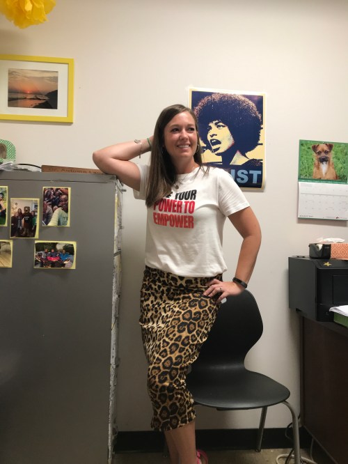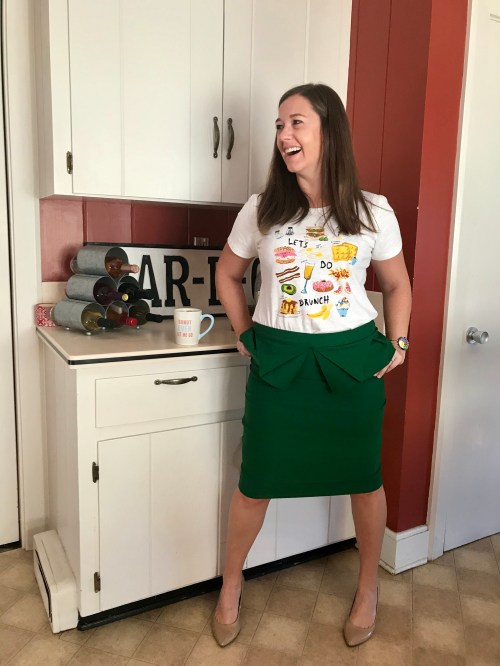 Everything was perfect about this green pencil skirt (which also comes in thirteen other colors and patterns) except for the sizing. One of the reviewers who had a height and weight about the same as mine said the medium was kind of loose on her, so I went with the medium. Bad decision. What you can’t tell in this picture is that the skirt is only zipped about halfway (and forget about trying to get it hooked!). The fit was fine in the hips because there is some stretch to the material, but a large would’ve been a better option.