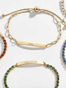 A bar bracelet is the perfect option if you want something a bit more personalized. You can customize the bracelet’s base (14k gold paperclip chain, or clear/sapphire/emerald/garnet cupchain), add a name or initials, and select your font.