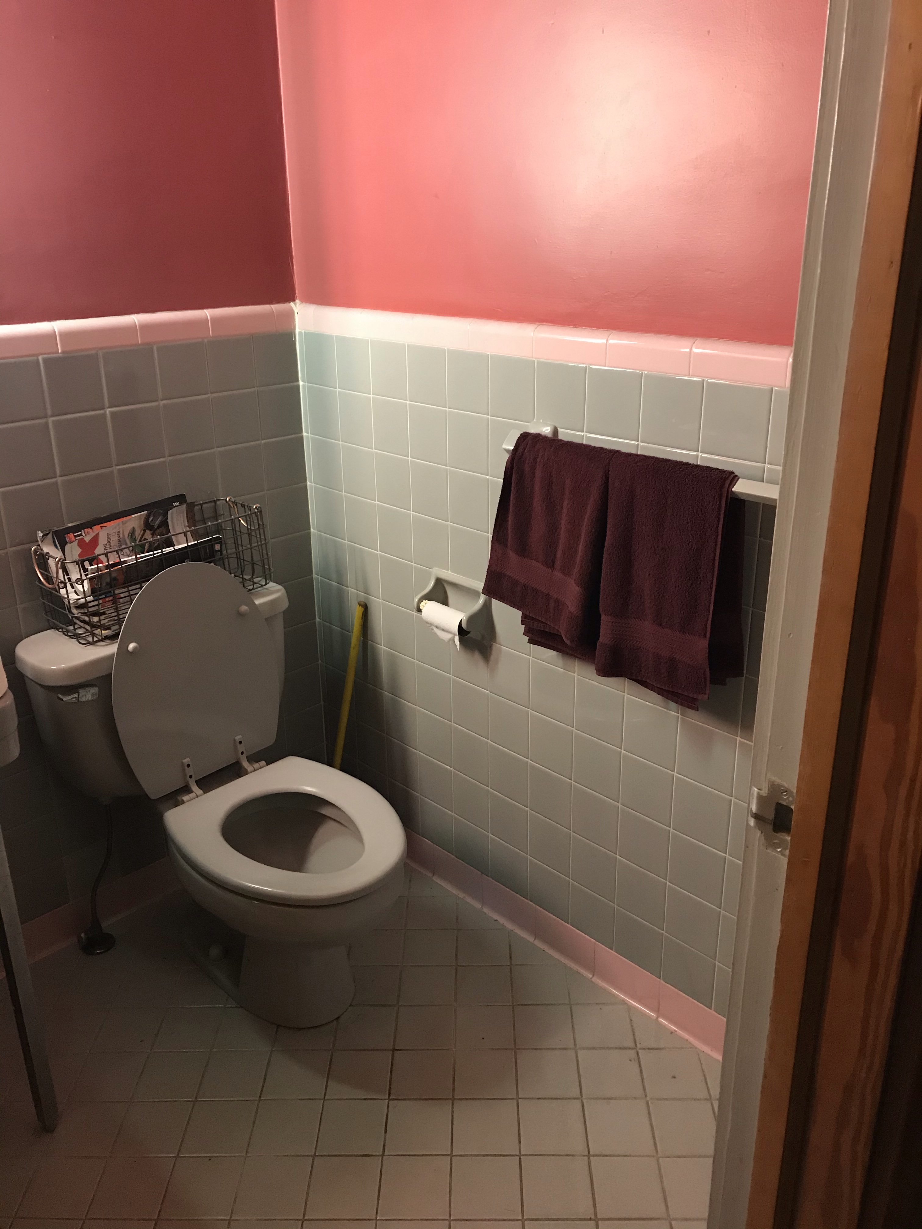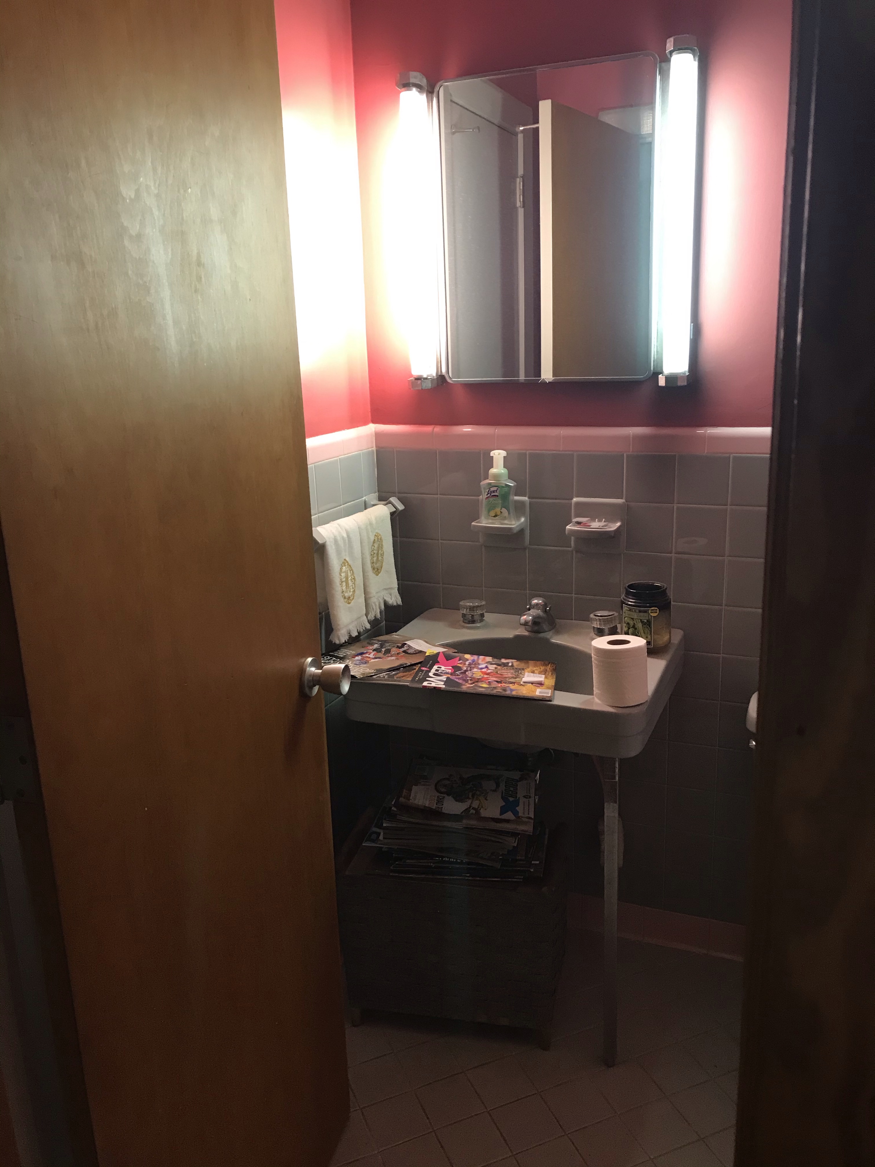 BUT ANYWAY…bathroom renovation. I hated this bathroom from the moment I saw it. Blue tile. Blue toilet. Blue sink. Pink tile. Red/pink paint. Madness. And the sink hasn’t worked since we first started dating in 2015.