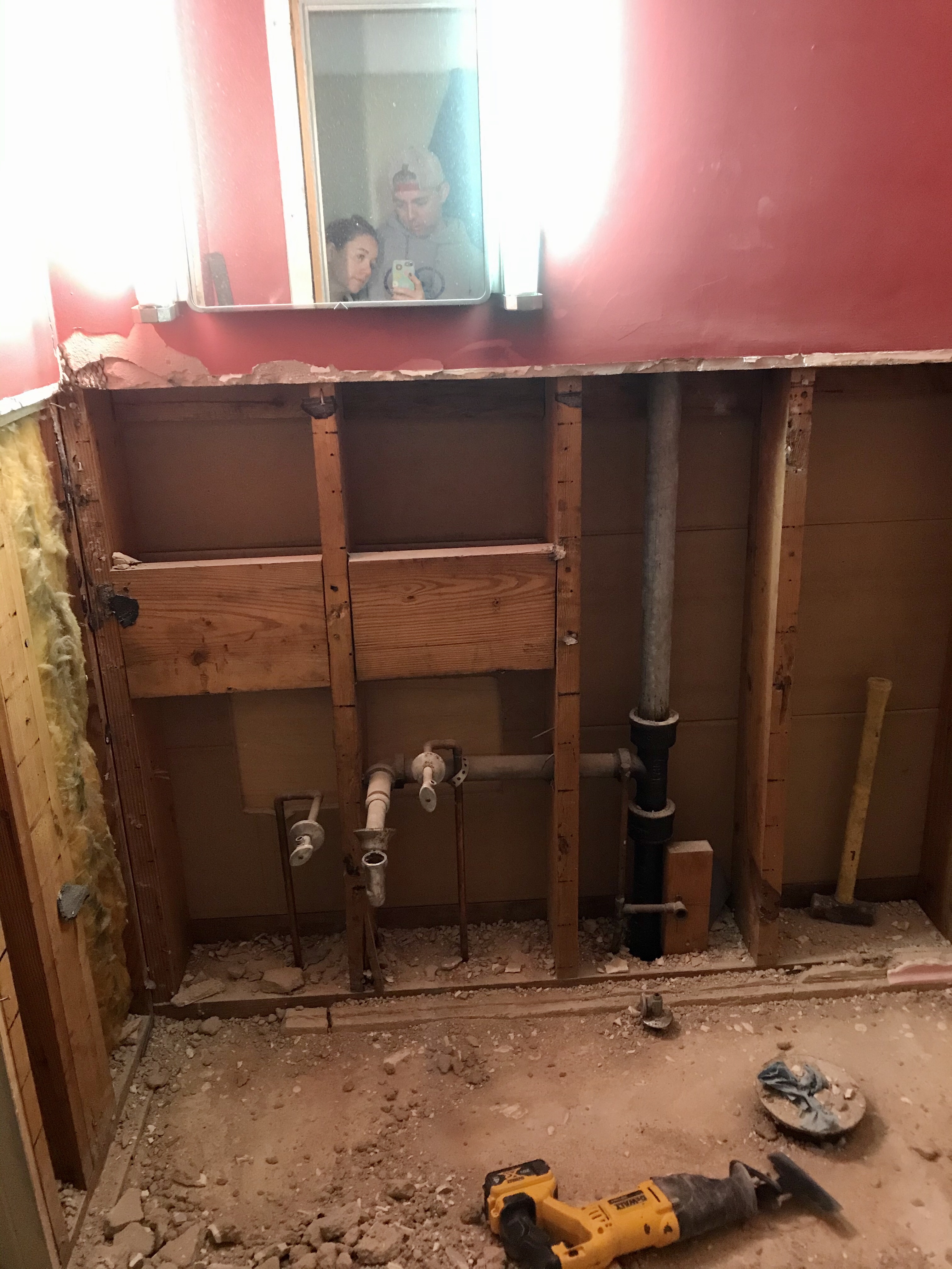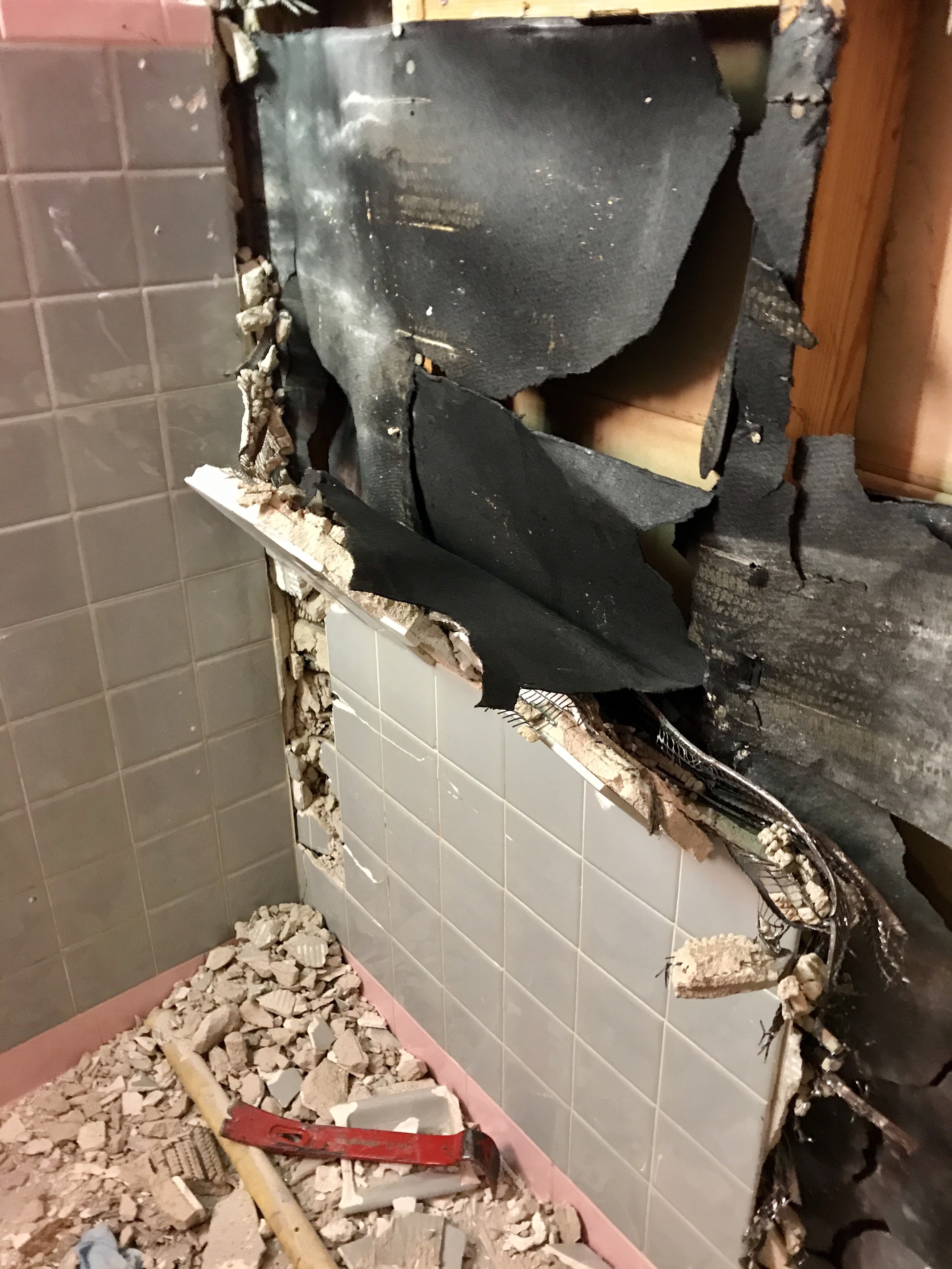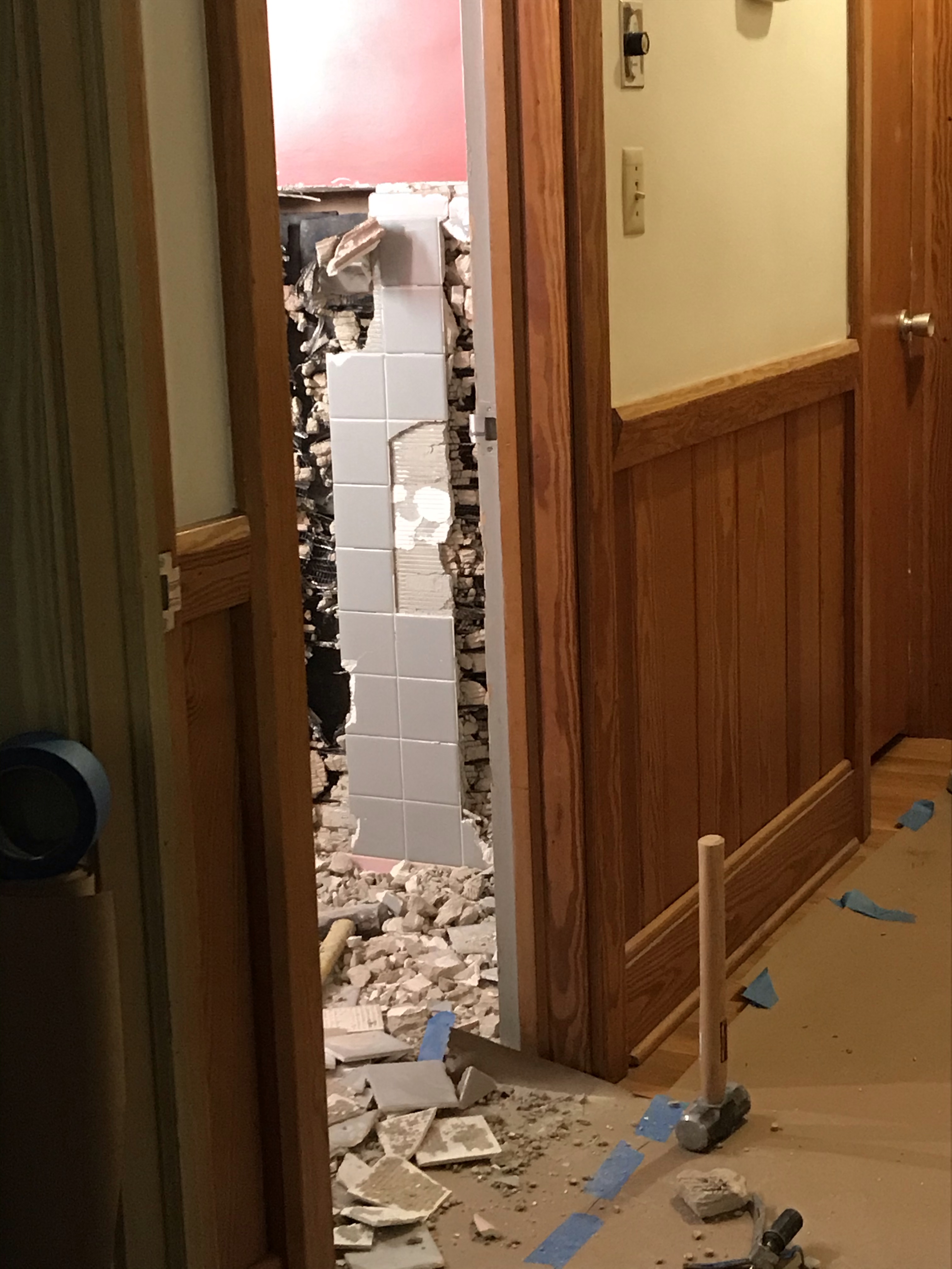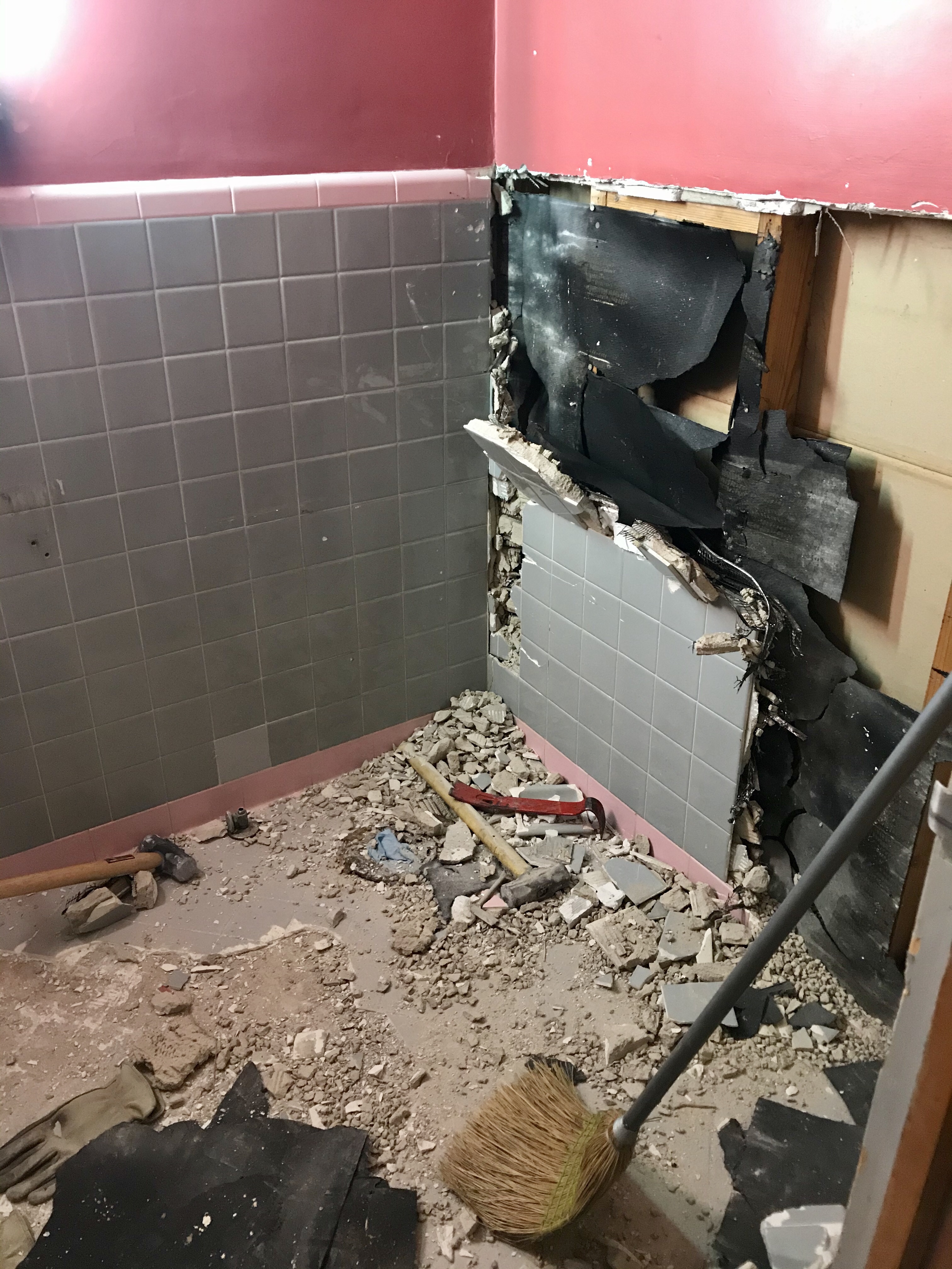 None of us really knew what we’d find behind the tile, but it was a lot more than what anybody bargained for. The two guys doing the renovation worked for about 3 hours the first Friday night and managed to get one small chunk off the wall. “They don’t make ’em like they used to” was for sure an accurate phrase – there was metal lining, nails, and a massive chunk of cement (not mortar, CEMENT) at least two inches thick. I think we would’ve survived any natural disaster hunkered down in that bathroom.