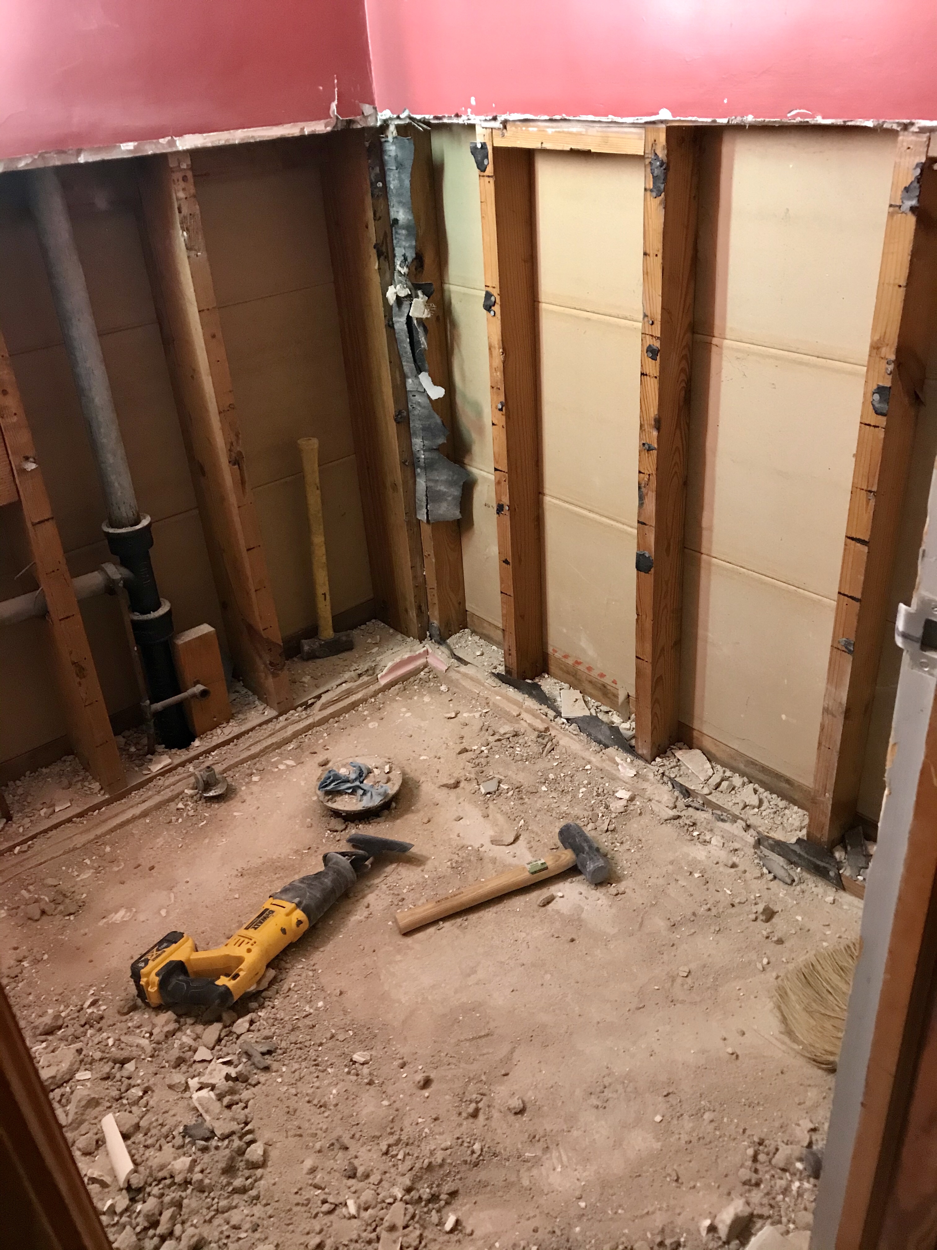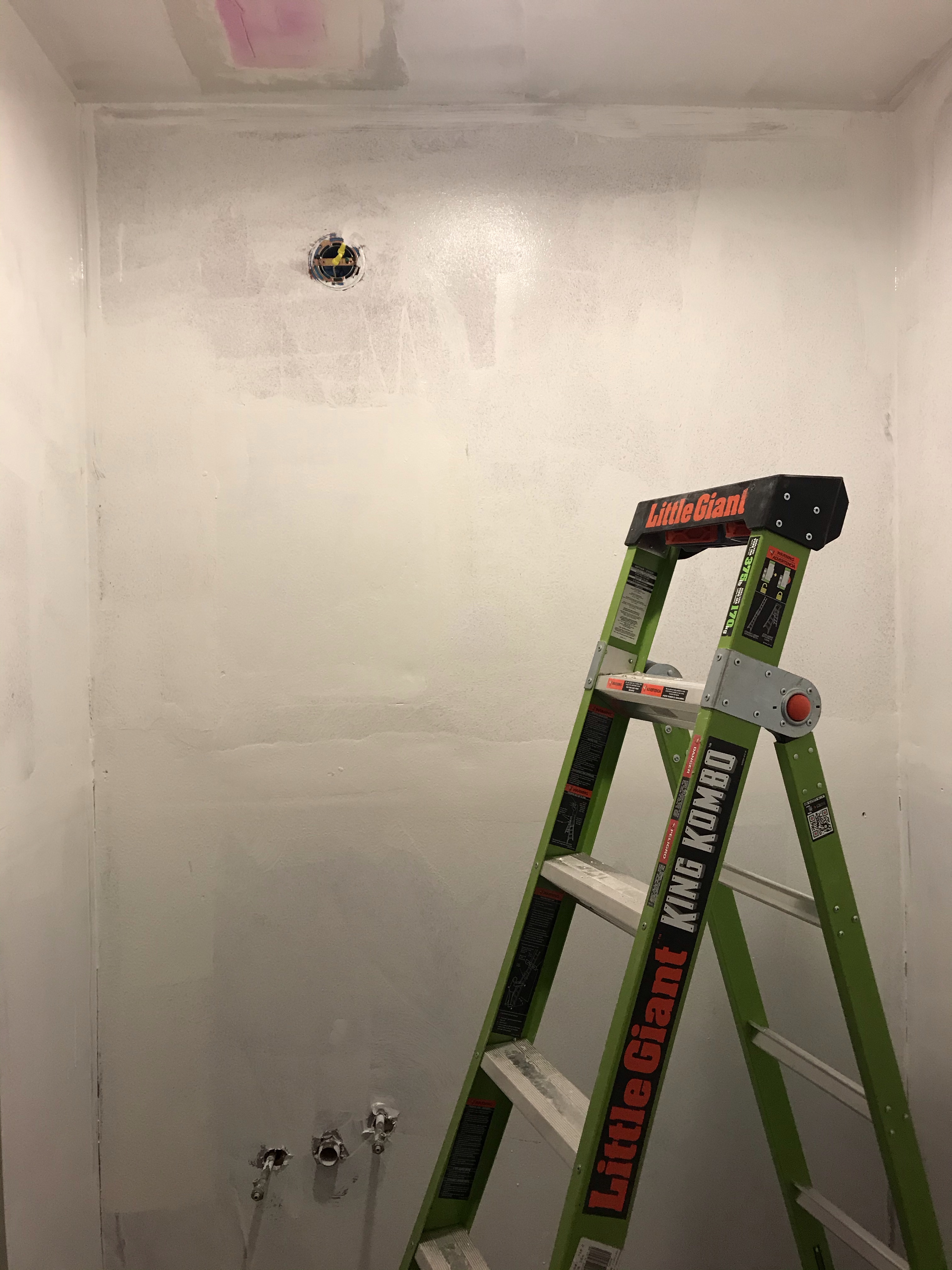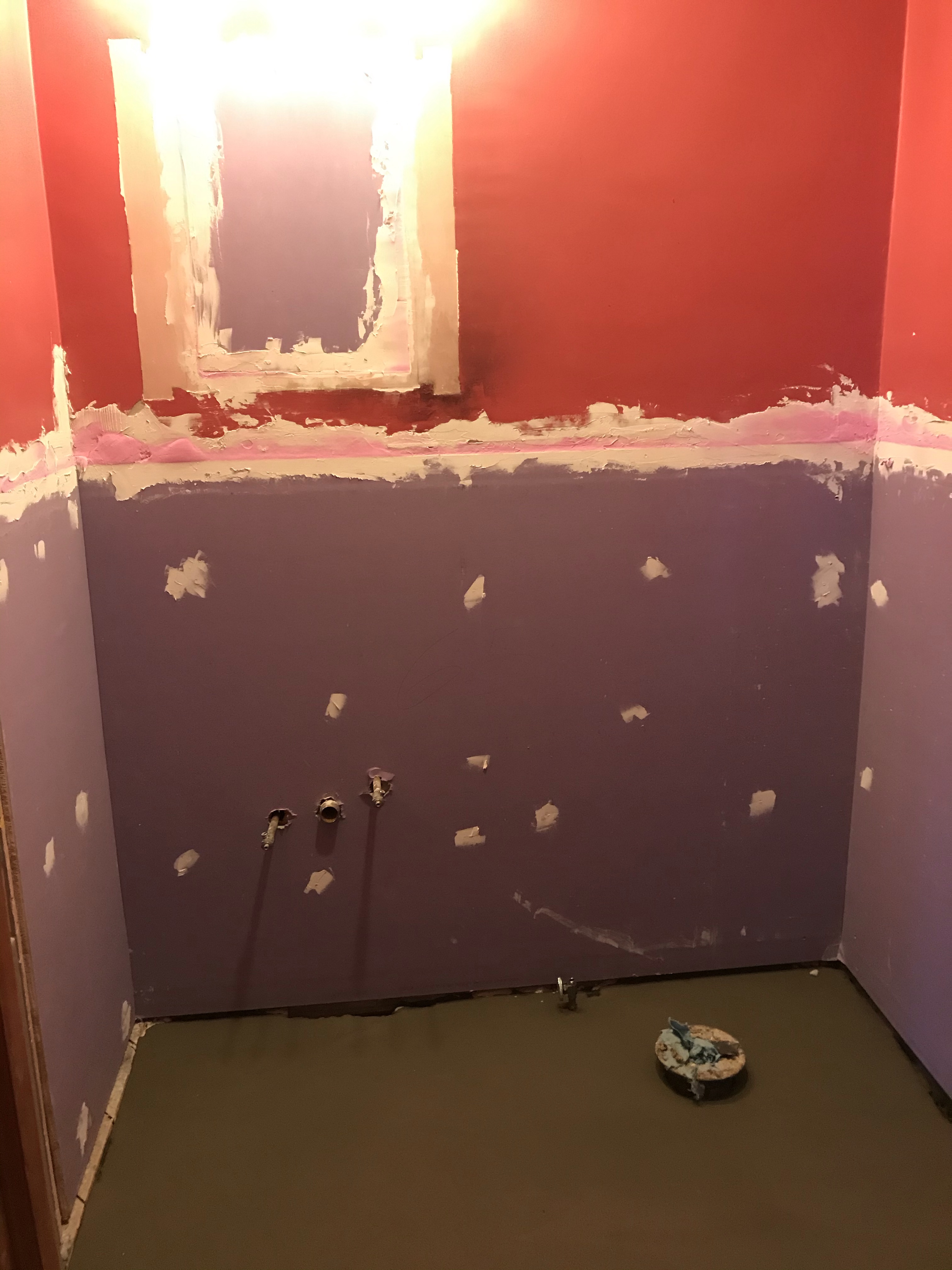 Since the tile was so thick on the walls and the floor, there was a lot of restructuring that had to happen. They had to add a ton of cement to get the floors higher and had to add drywall. Unfortunately, we can still see the seams where the two halves of the drywall were put together (but they did the best they could…and it still looks better to me than that tile).