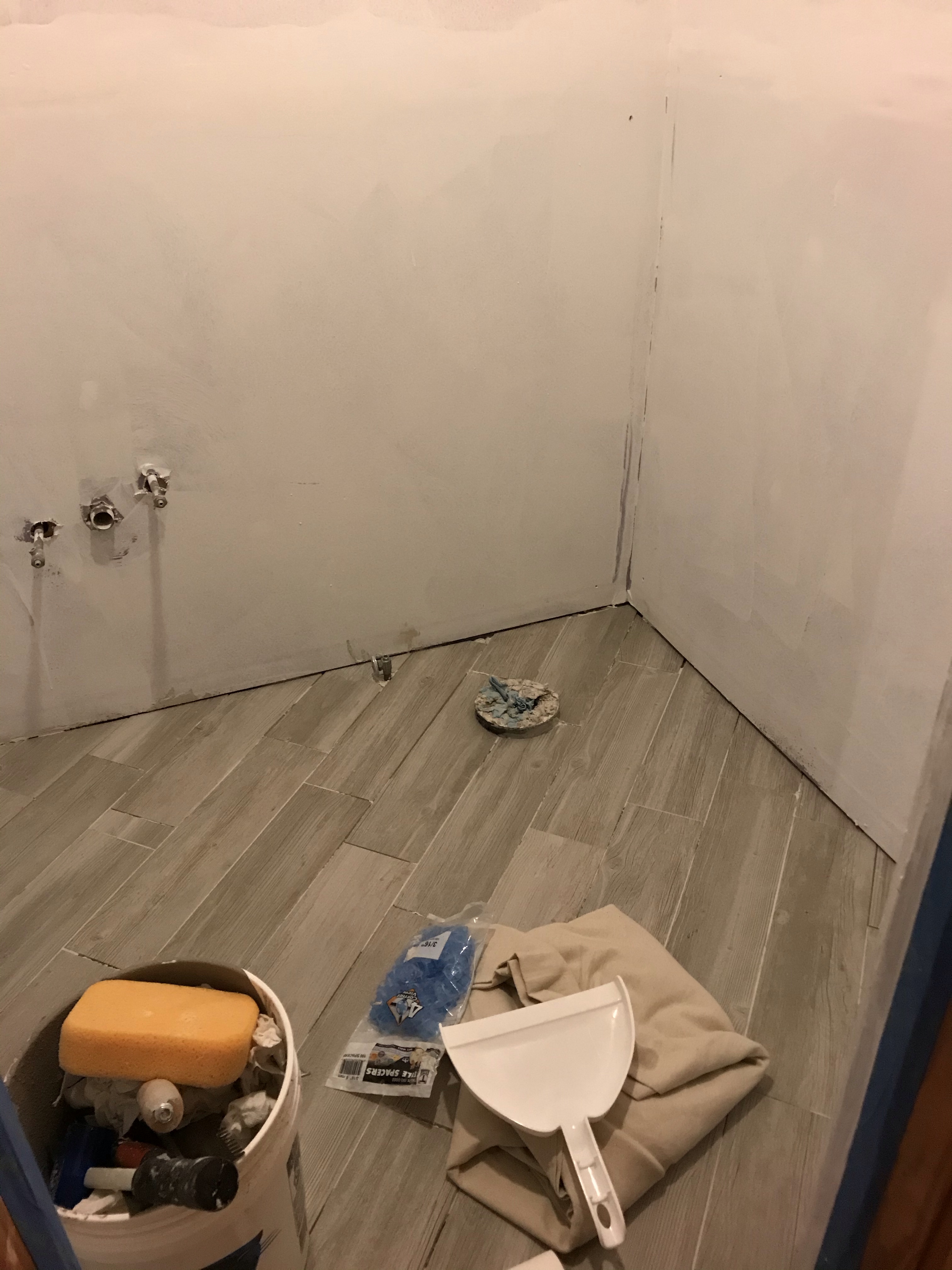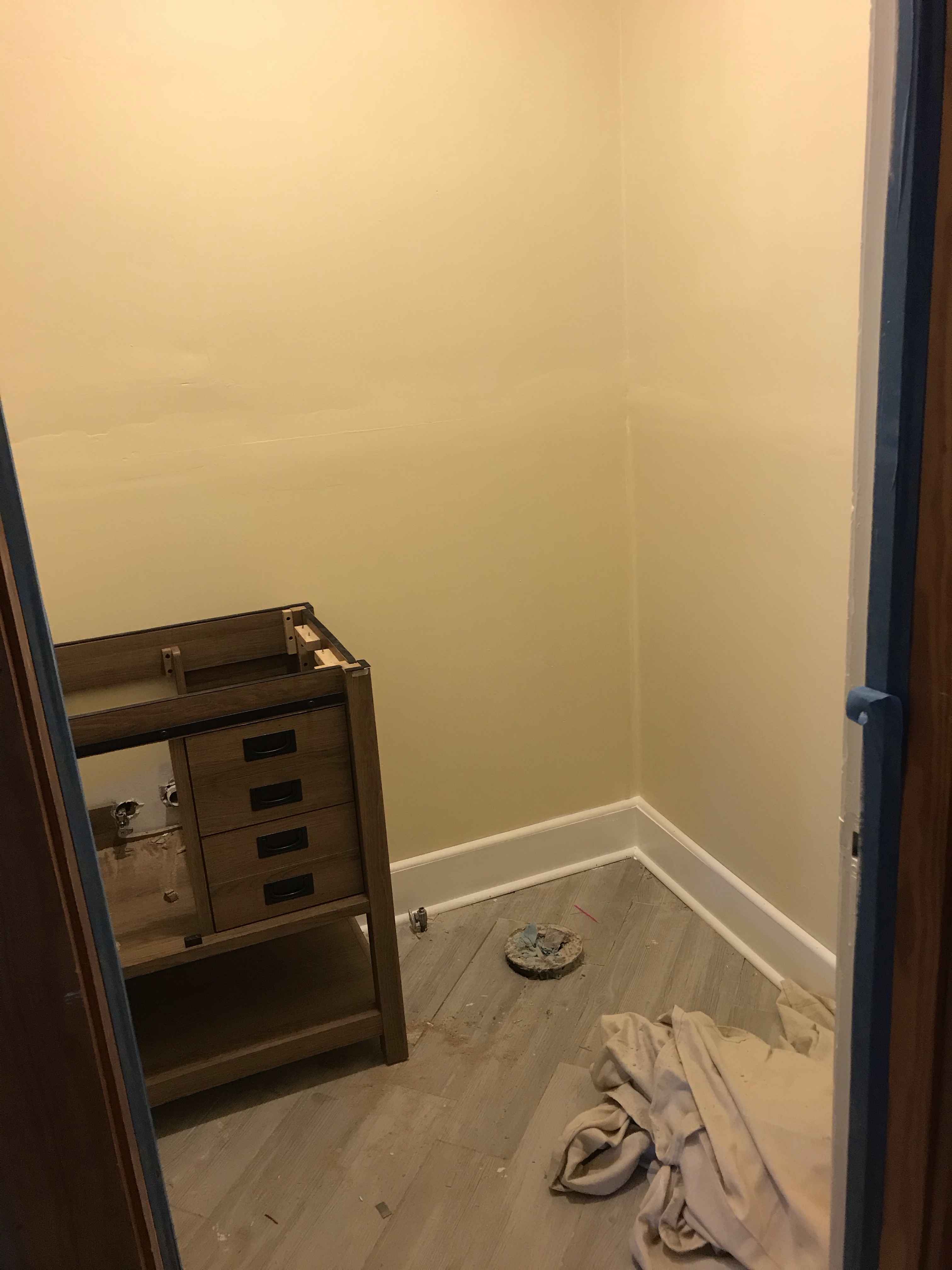 Next came A LOT of primer and the flooring. We have wood floors in the hall, so I wanted something a little bit different and after MANY visits to Lowe’s, finally picked this gray tile that looks like wood. Originally, I really wanted patterned tile, but my husband wasn’t a fan. I’m happy with the simplicity of this, though. I don’t think they were super happy with me when I said I wanted them diagonal, but I thought it was much more visually appealing than just having lines of tile.