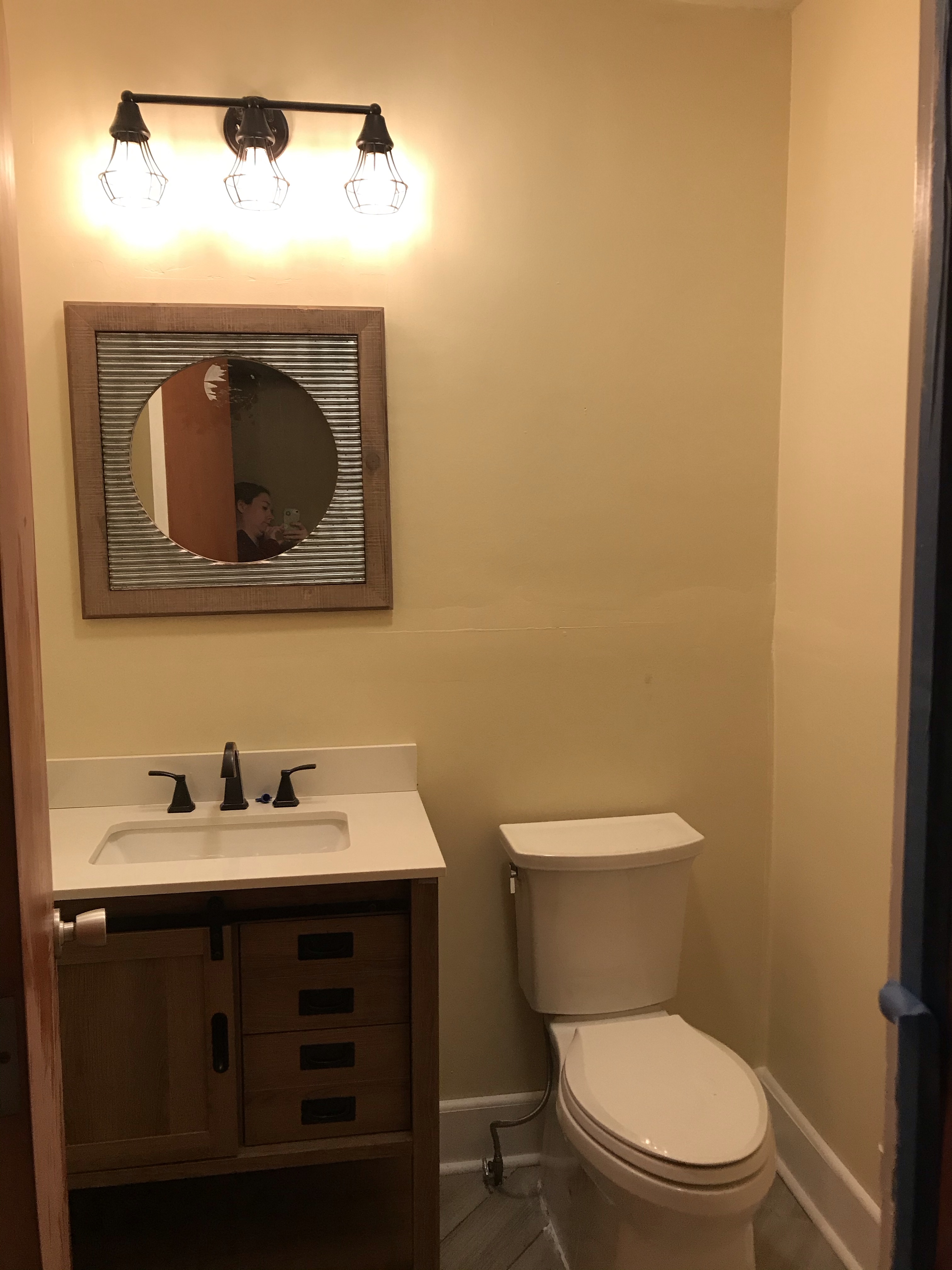 But even with a funky mirror, I’m so much happier with the end results. The yellow paint really brightens up the small room, and it’s so wonderful to have a sink that works, especially with all the COVID hand washing!