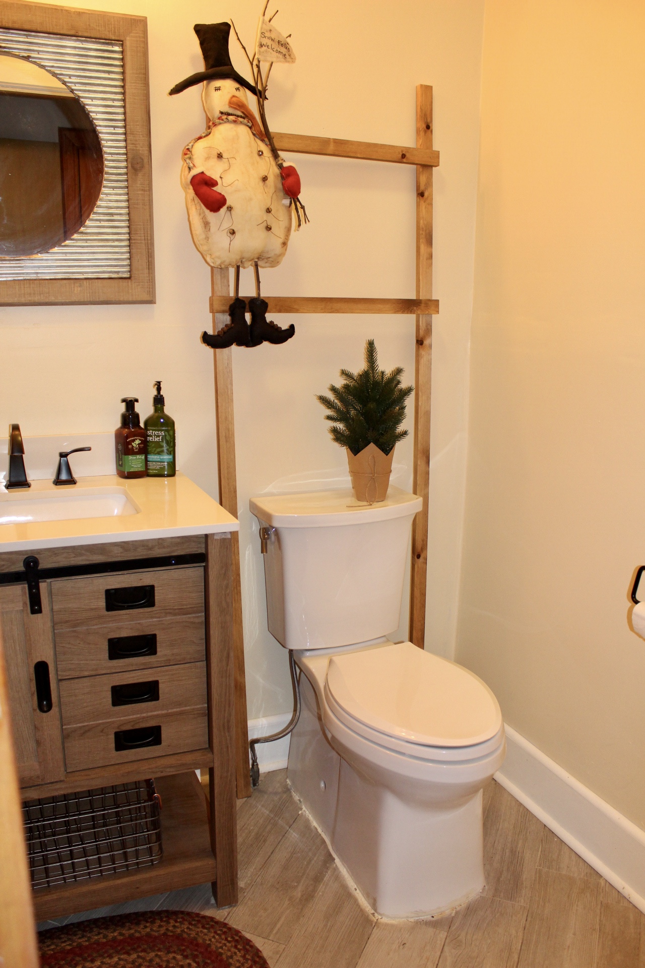 I also picked out this simple vanity from Lowe’s because I wanted something unique and loved the barn door. (Unfortunately, I can’t find it on the Lowe’s website to link it. Sorry!) It also matched perfectly with the bronze of the lights and the faucet.