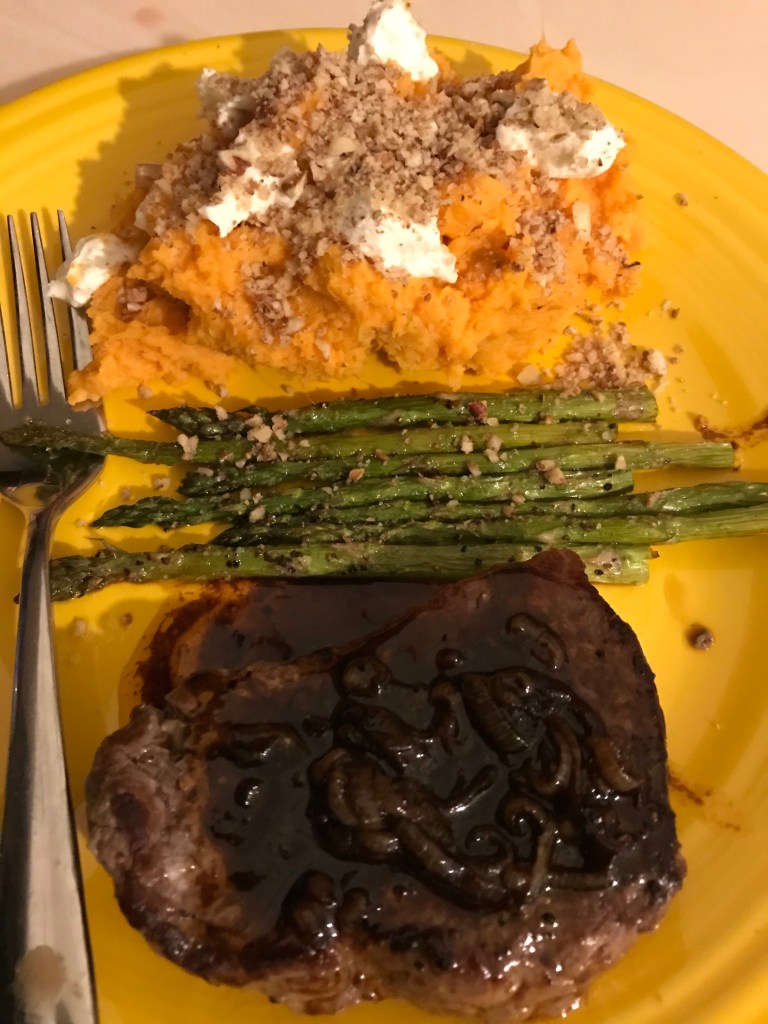 This recipe required cooking the steak in a skillet, which we’ve attempted in the past with disastrous effects. I’m not sure why it worked this time, but these steaks were delicious! I’ve never made a glaze for a steak, but this glaze was fantastic and we’ll absolutely use this recipe in the future to make our steaks a bit fancier. This meal, even though it was something we’ve cooked ourselves before (steak, sweet potatoes, and asparagus is a meal we often turn to), was our favorite!