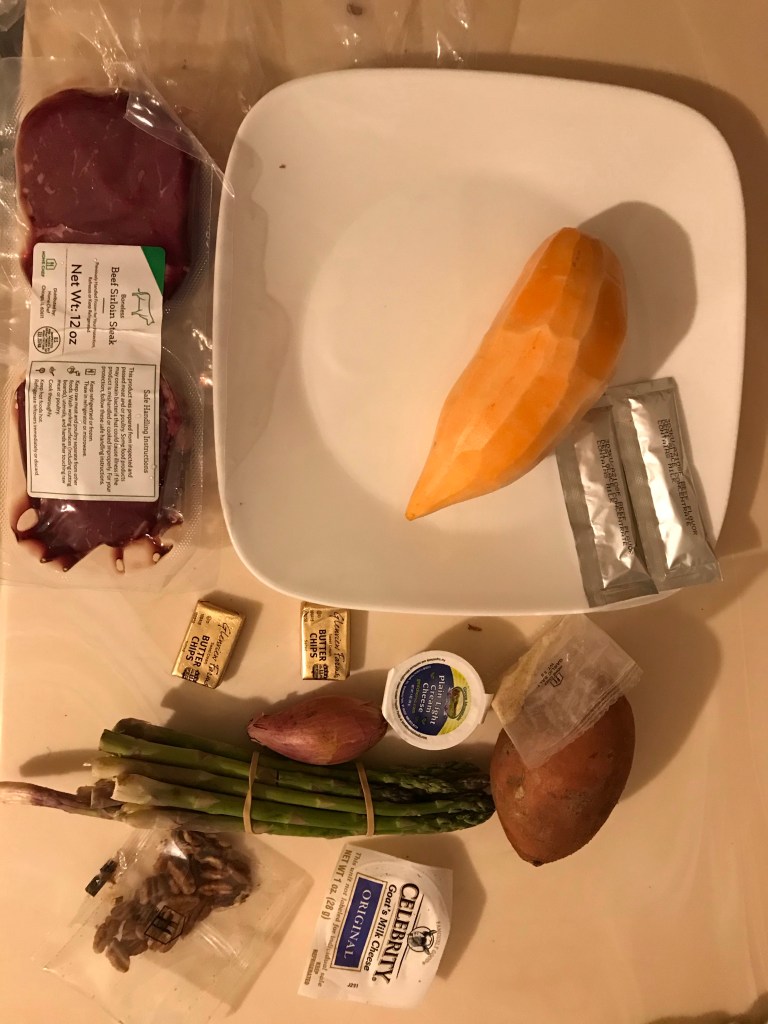 The next meal was an upgrade since it included sirloin steak. There are always meals listed for the week that are considered premium and are more expensive than the regular meals. We thought it was worth paying an additional $8 for the Steak and Goat Cheese-Pecan Sweet Potatoes – we frequently get steaks at the store and oftentimes end up paying way more for those anyway, so this felt worth it.